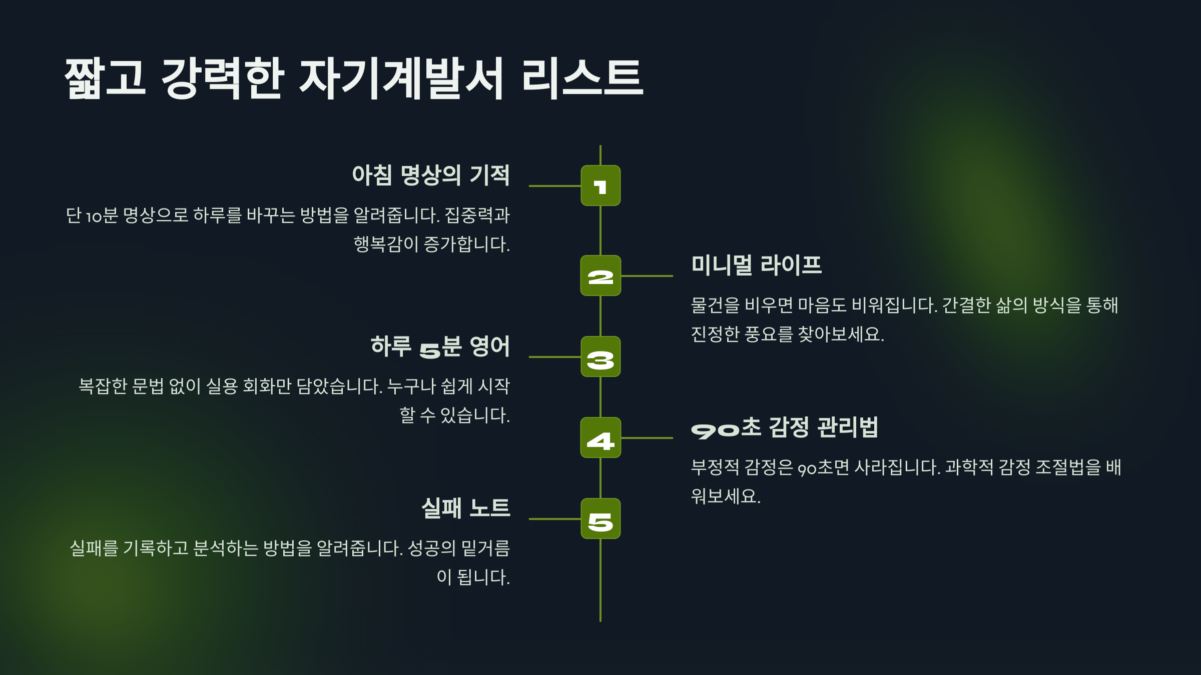 이제 정말 읽기만 하면 되는 최고의 리스트를 소개할게요! 바로 다음 섹션에서 짧고 강력한 자기계발서 리스트 나갑니다.