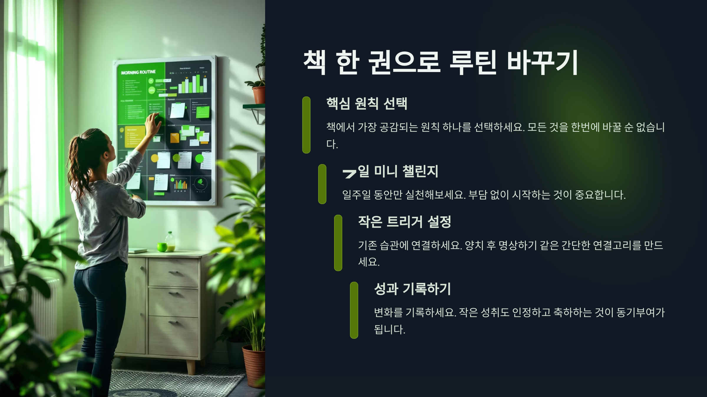 이 책들 중 하나라도 지금 당신의 마음을 건드린다면, 망설이지 말고 한 권 장바구니에 담아보세요. 다음 섹션에서는 이렇게 고른 책으로 일상의 루틴을 어떻게 바꾸는지 구체적인 방법을 소개할게요! ⏰