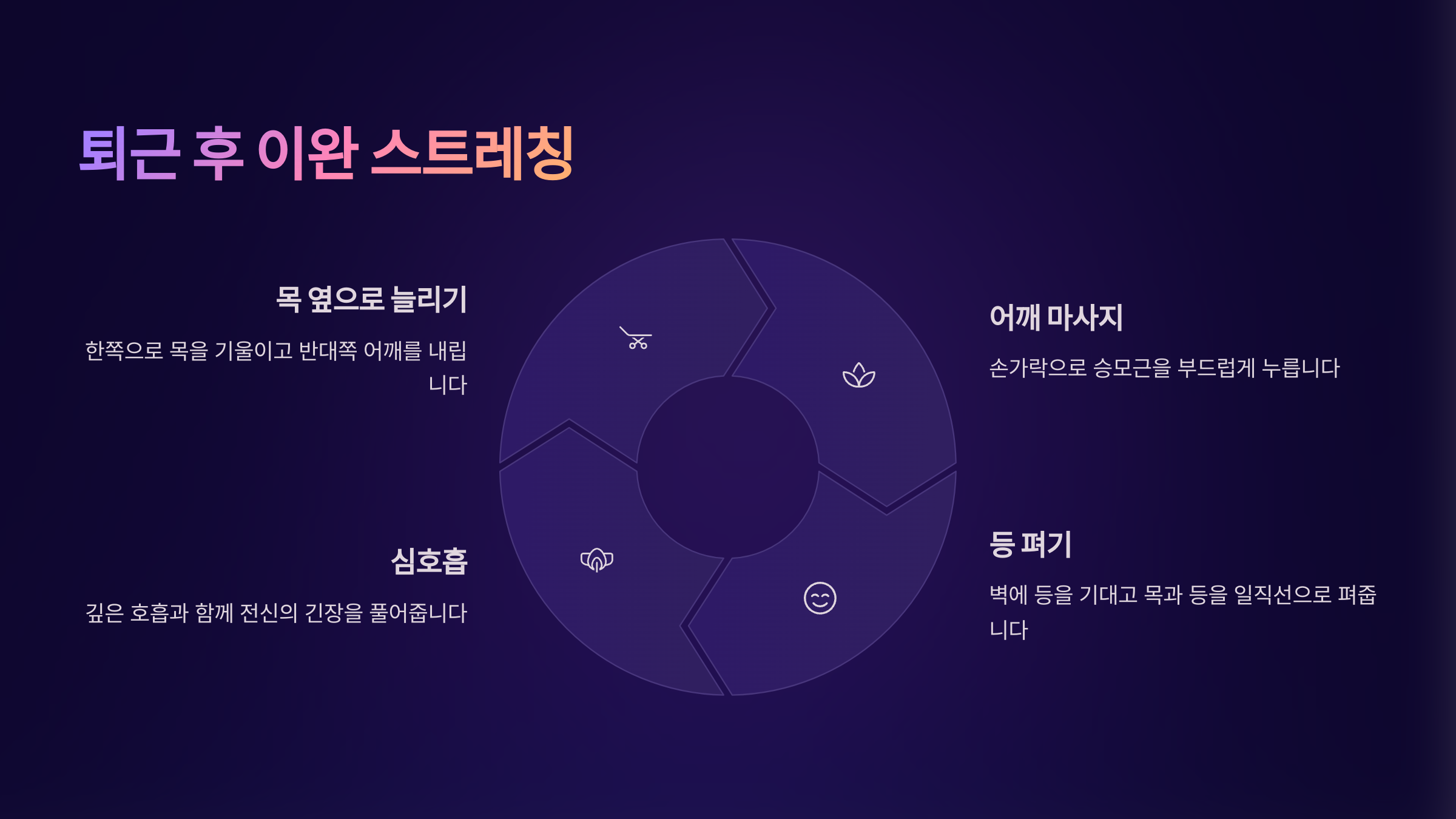 퇴근 후에는 누워서 하는 스트레칭이 좋아요. 바닥에 눕고 수건을 돌돌 말아 목 뒤에 받친 다음, 가볍게 고개를 좌우로 흔들면 경추가 정렬되면서 긴장이 풀려요.