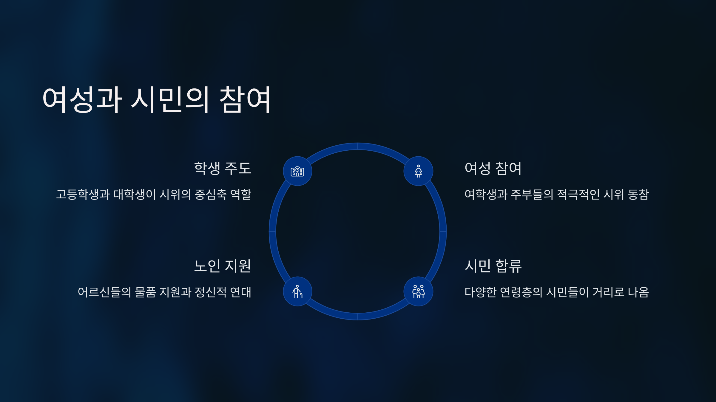 | 상인, 노동자 | 시위 식량 제공, 시위 동참 | 사회 연대 촉진 |