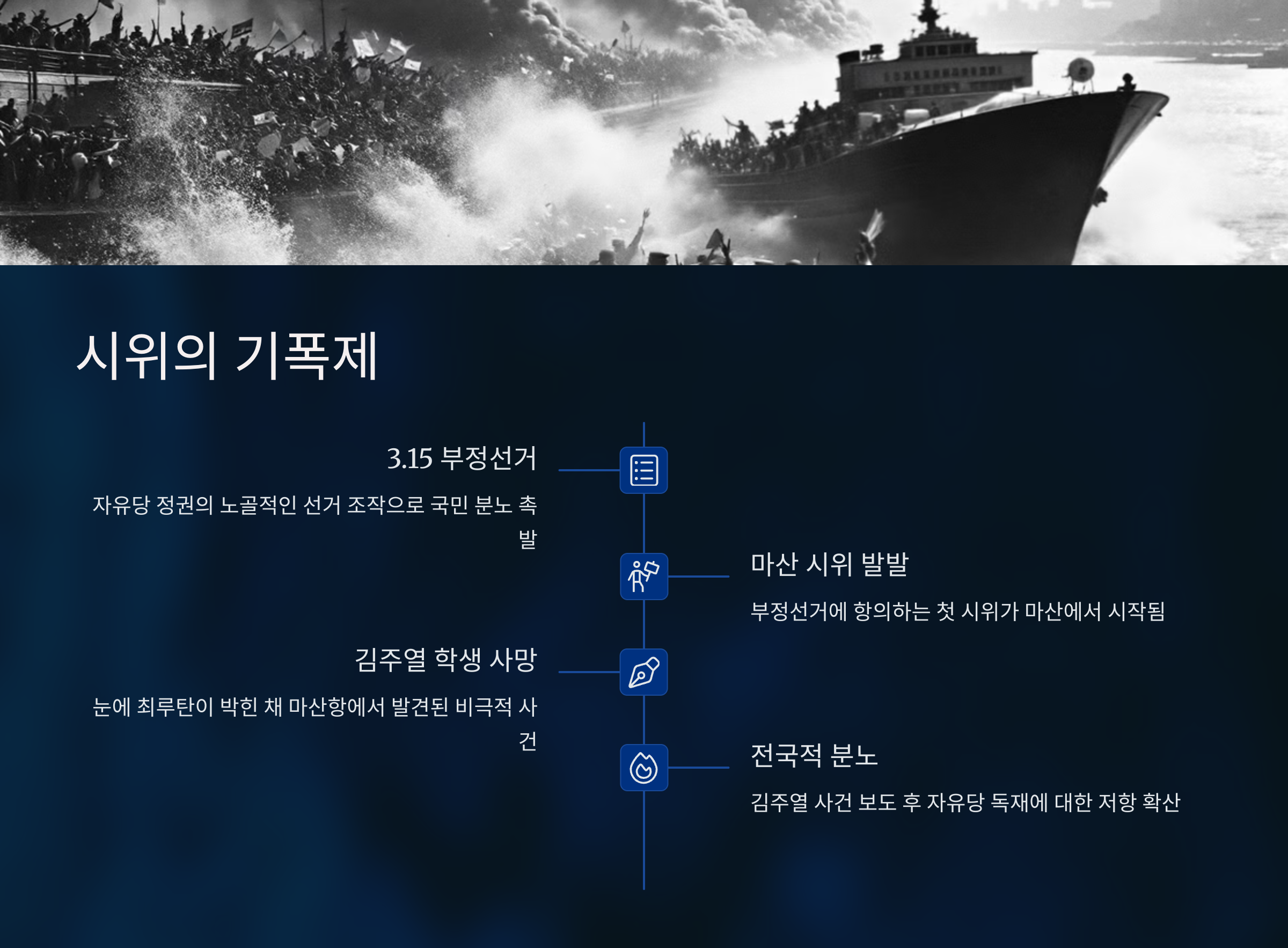 | 3월 15일 | 부정 선거 발생 | 초기 항의 시위 시작 |