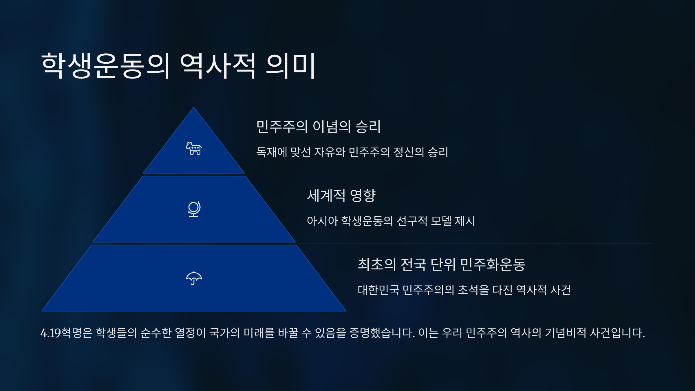 이 운동은 이후 5.18 광주민주화운동, 6월 항쟁 등으로 이어지는 민주주의 계보의 첫 걸음이 되었어요. 4.19는 명백히 평화적 저항의 힘, 그리고 정당한 분노가 어떤 변화를 일으킬 수 있는지를 보여준 사례였죠. 이 사건을 통해 “시민이 주권자다”는 의식이 국민 사이에 강하게 자리 잡게 되었어요.