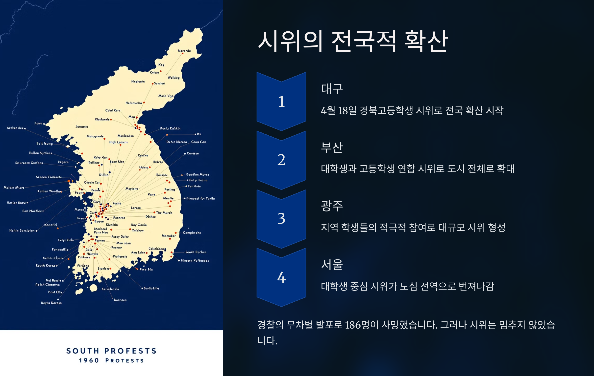 | 4월 19일 | 대규모 시위, 경찰 발포 | 민중 혁명으로 확산 |