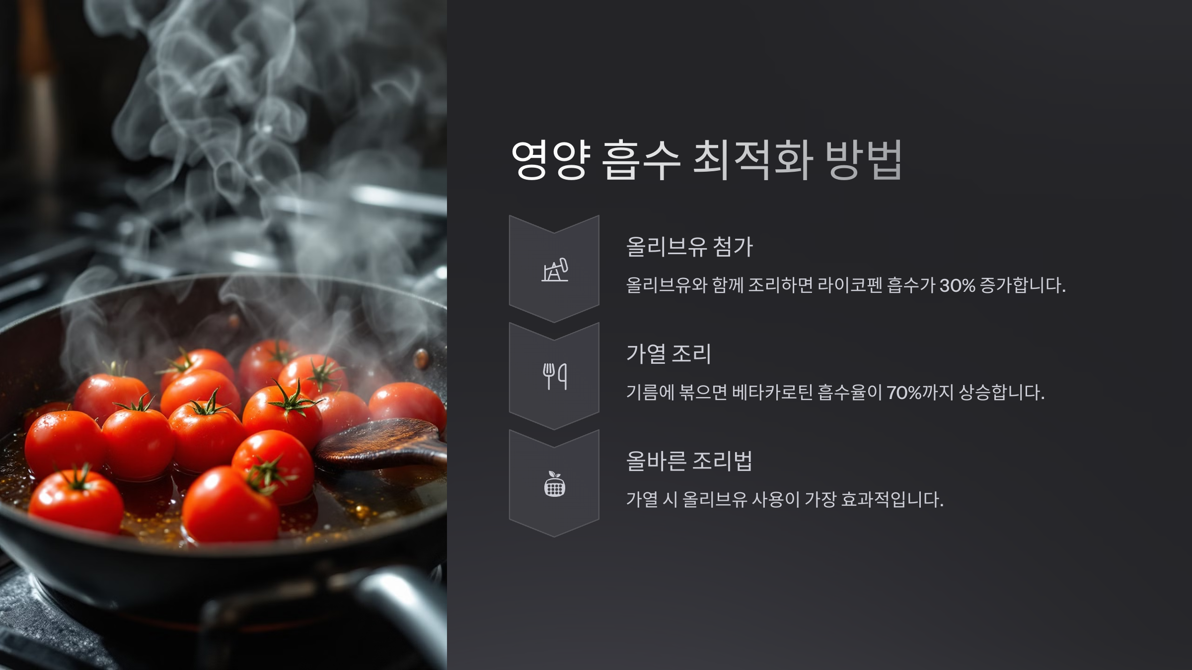 토마토를 생으로 먹는 것보다 익혀 먹을 때 항염 효과가 더 커져요. 특히 올리브유에 살짝 볶거나 구우면 지용성 비타민 흡수도 좋아진답니다. 🍽️