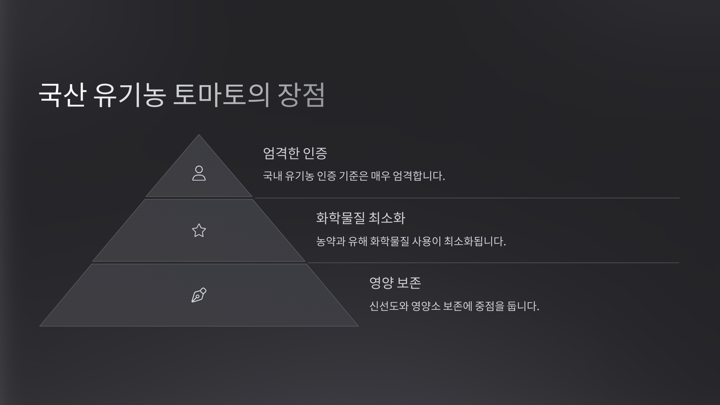 국내 유기농 토마토는 '친환경 인증 마크'가 붙어 있는지 꼭 확인해보세요. 국립농산물품질관리원에서 인증한 제품만 '유기농'이라는 명칭을 사용할 수 있어요.