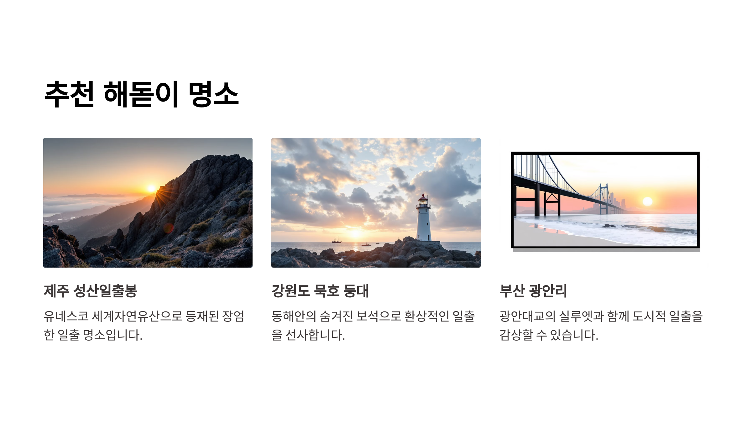 | 부산 | 해운대 해수욕장 | 도심 속 접근성 높고 일출 조망 탁월 |