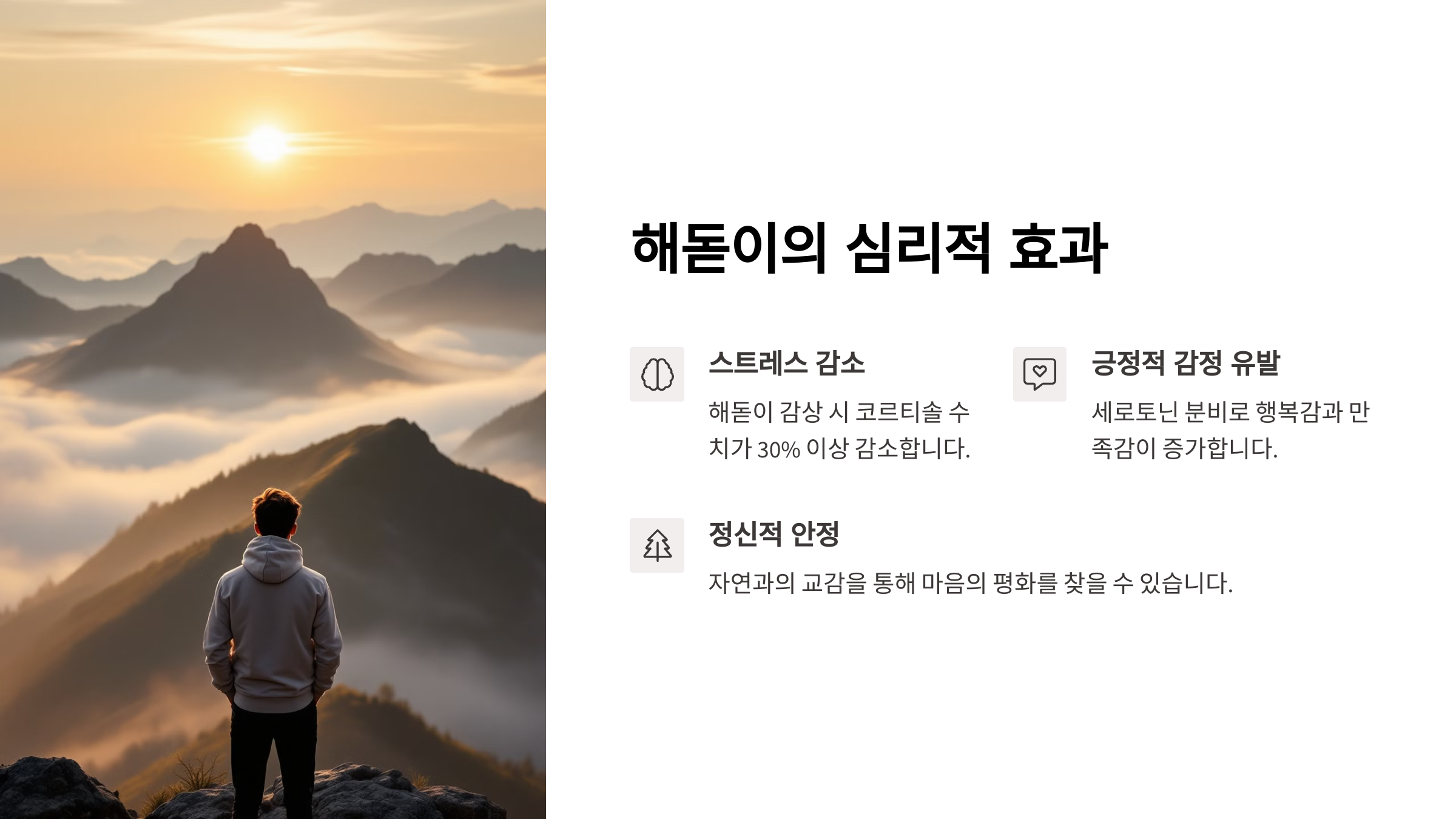 심리학자들은 해돋이처럼 천천히 진행되는 자연 현상을 관찰할 때, 사람의 마음이 느려지고 호흡이 안정된다고 말해요. 이런 순간은 명상 효과를 유도하고 마음의 긴장을 완화시키는 데 큰 역할을 해요. 그래서 스트레스를 자주 느끼는 사람들이 해돋이 명소를 자주 찾는 거예요.