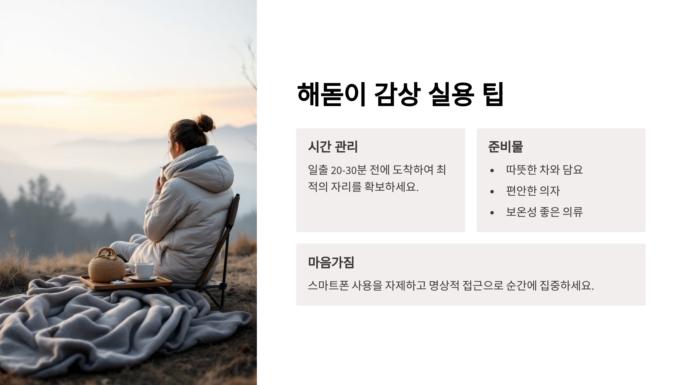 또 하나 흥미로운 건, 해돋이를 기다리는 그 '기다림의 시간' 자체가 이미 심리적 치유 과정이라는 거예요. 새벽에 일어나고 이동하는 시간도 포함해서, 그 과정을 계획하고 실행하는 것 자체가 삶의 주도감을 키우는 데 도움이 된다고 해요.