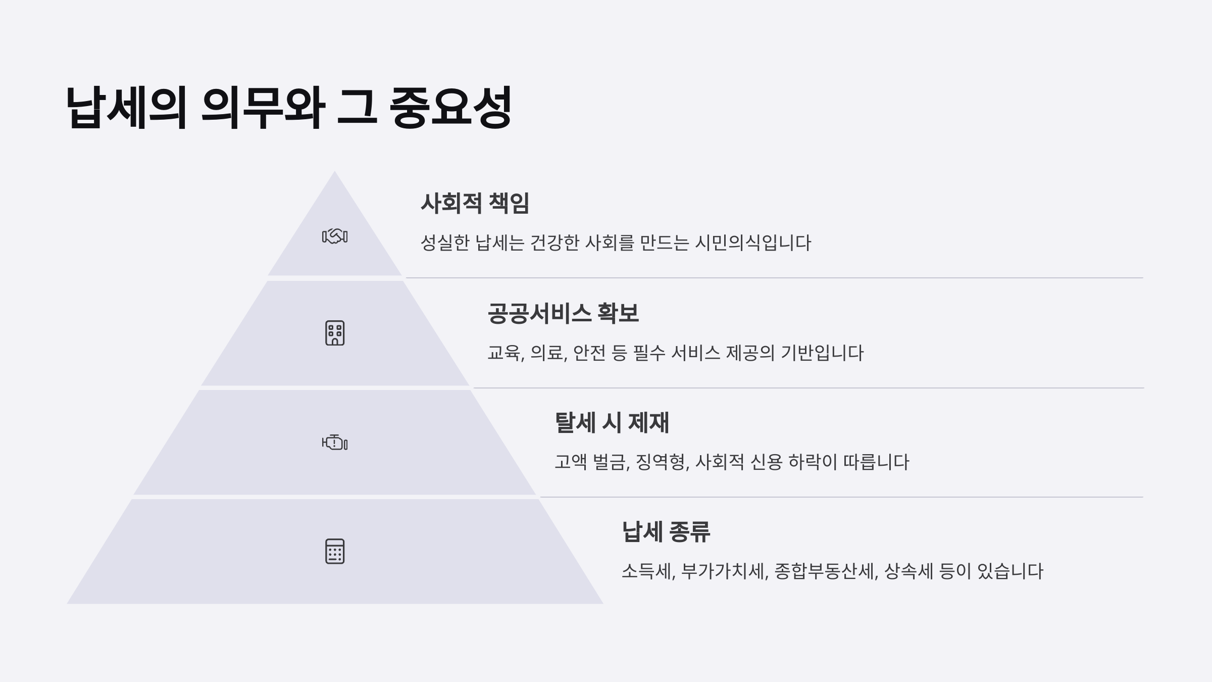 | 납세의무 | 정기 세금 납부, 성실 신고 | 국가 예산 형성, 복지 정책 실현 |