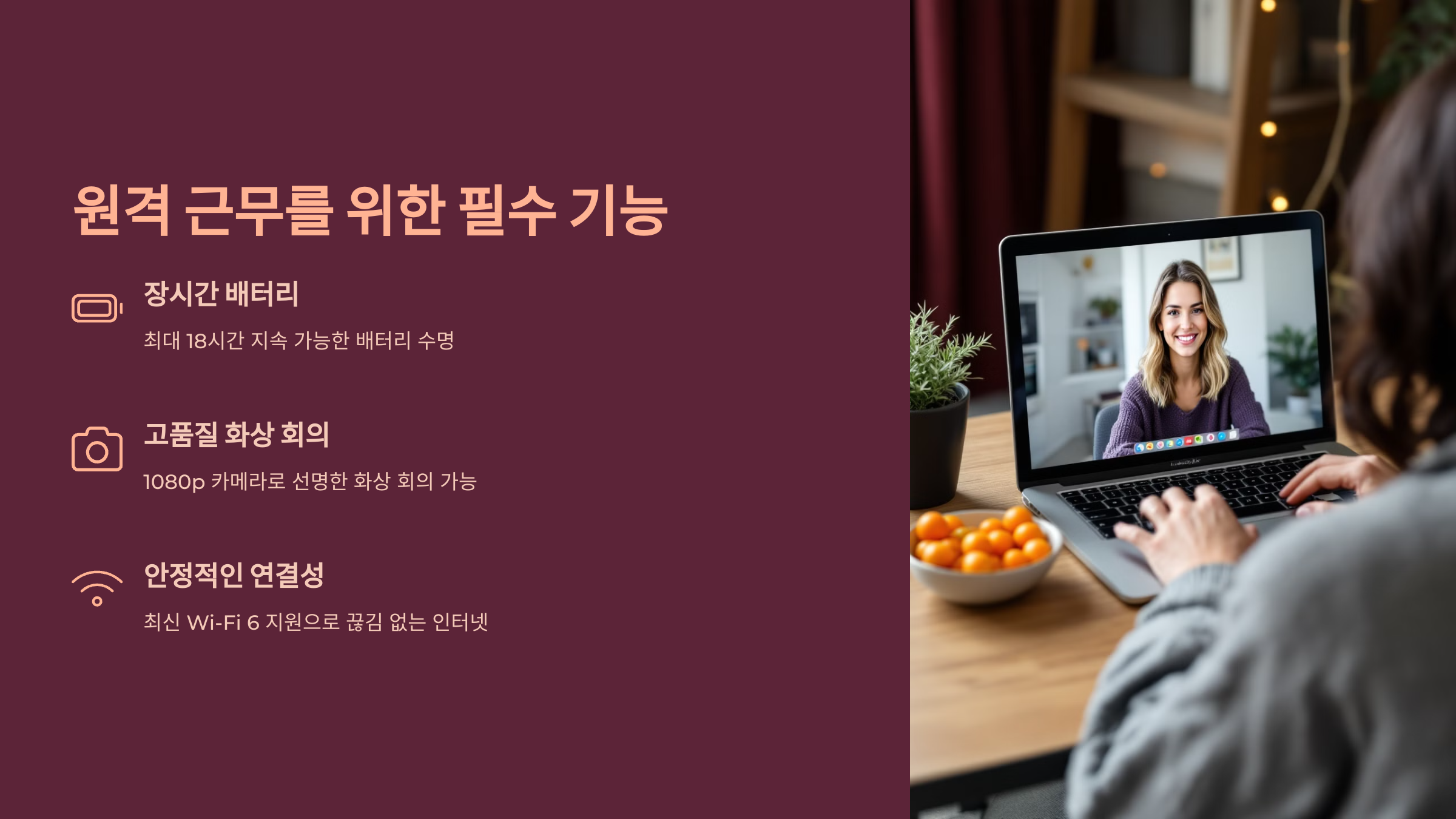 | FHD 웹캠 + 노이즈 캔슬 마이크 | 고화질 화상회의 가능 | 회의 집중도 향상 |