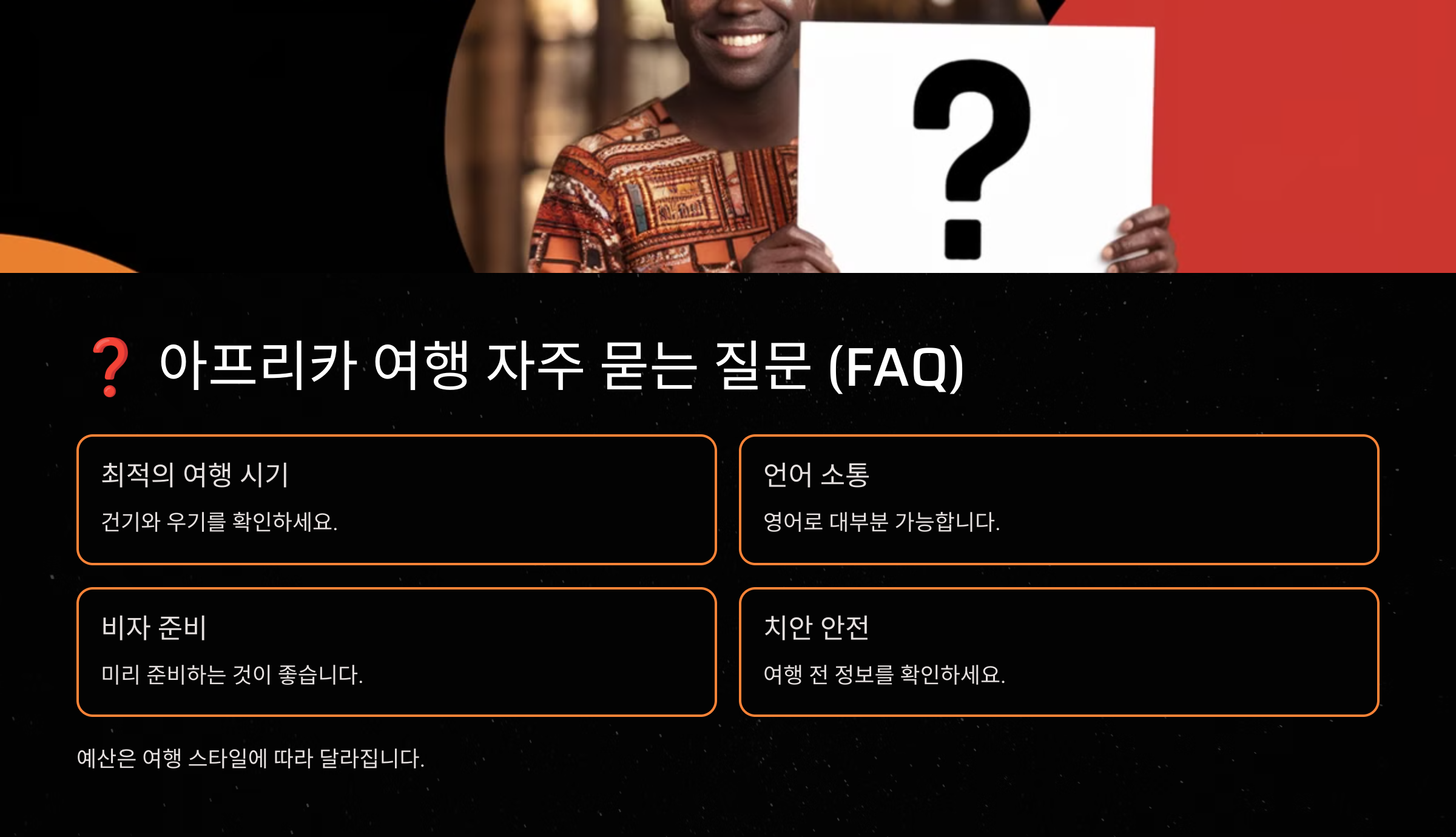 이제 아프리카 여행 준비는 끝났어요! 🦓🐘 다음은 **자주 묻는 질문(FAQ)**을 모아서 알려드릴게요! ✨