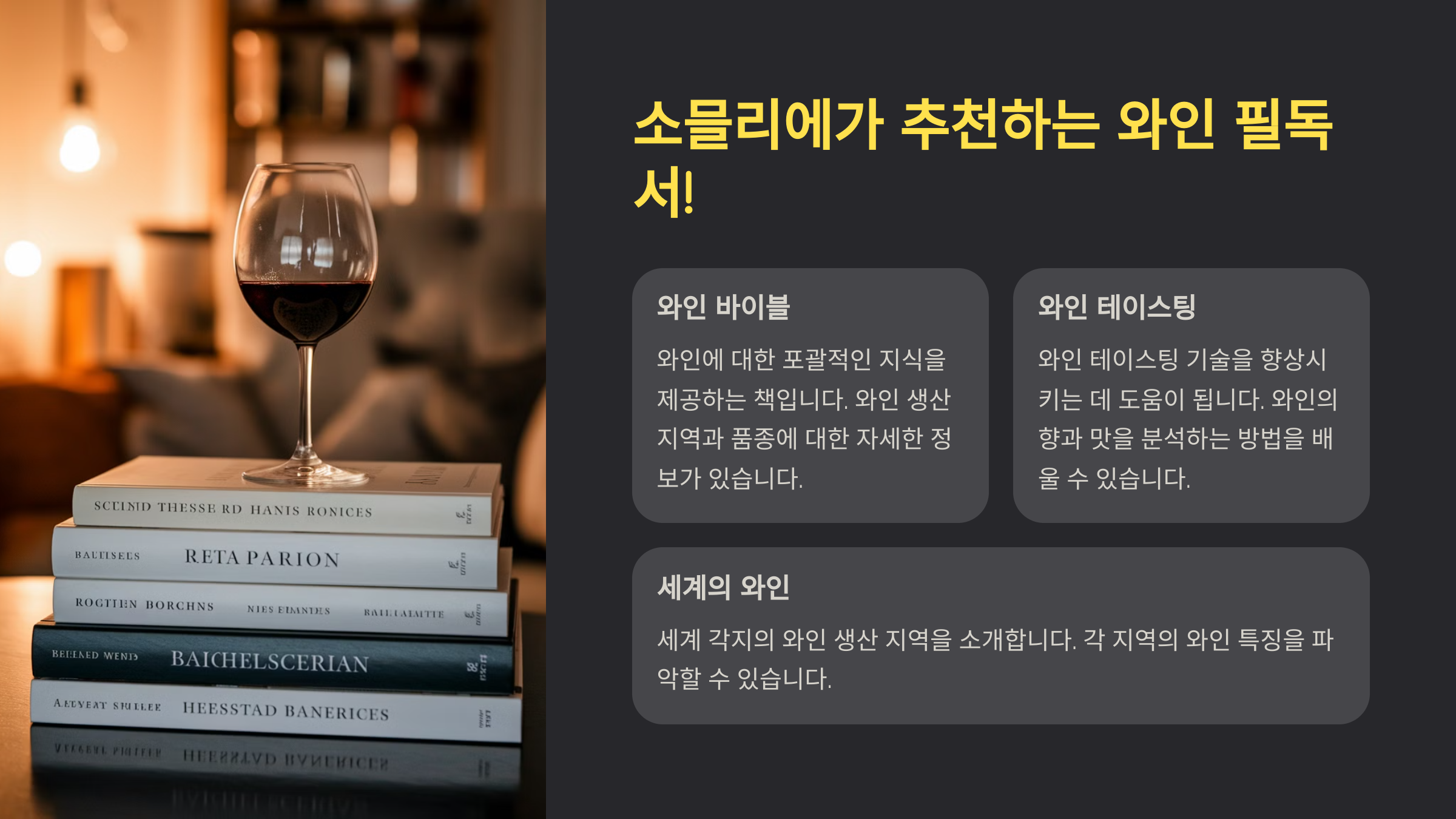 A1. 『와인의 세계』나 『소믈리에 바이블』 같은 기초 책을 먼저 읽으면 좋아요. 초보자도 쉽게 이해할 수 있도록 구성된 책들이에요. 📖
