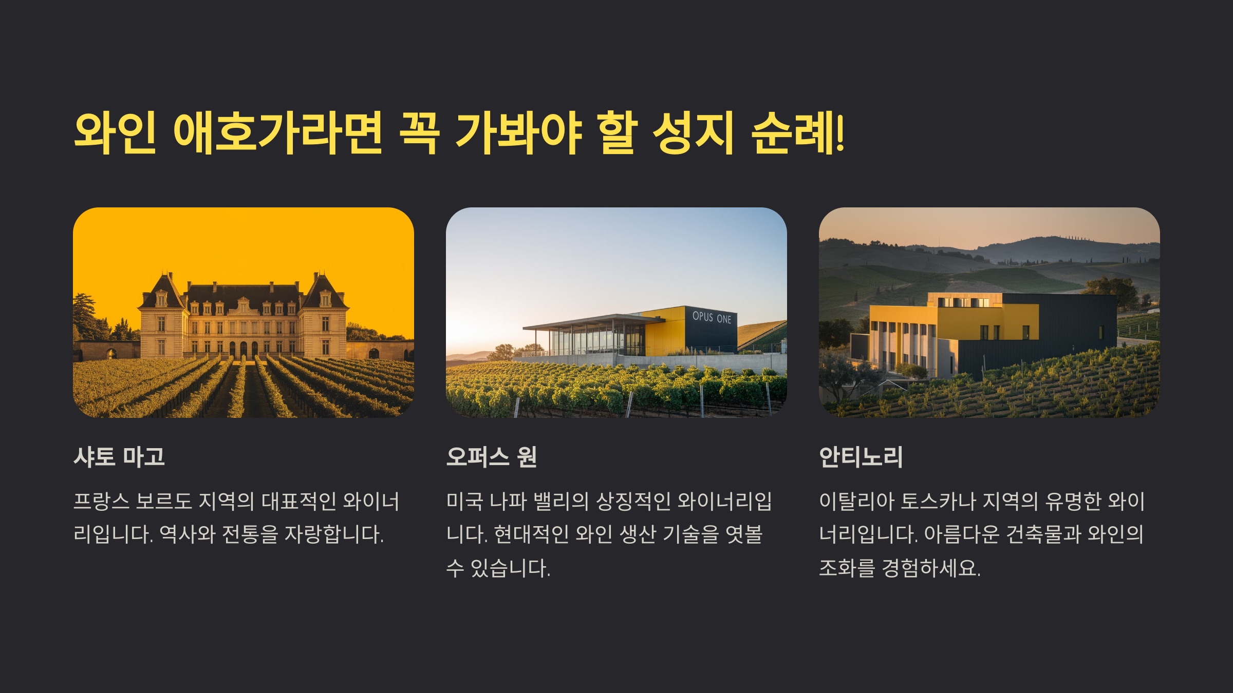와인을 사랑하는 사람이라면 한 번쯤 방문해야 할 와인 명소들이 있어요. 이곳들은 와인의 역사와 문화를 깊이 경험할 수 있는 특별한 장소들이랍니다. 🍷