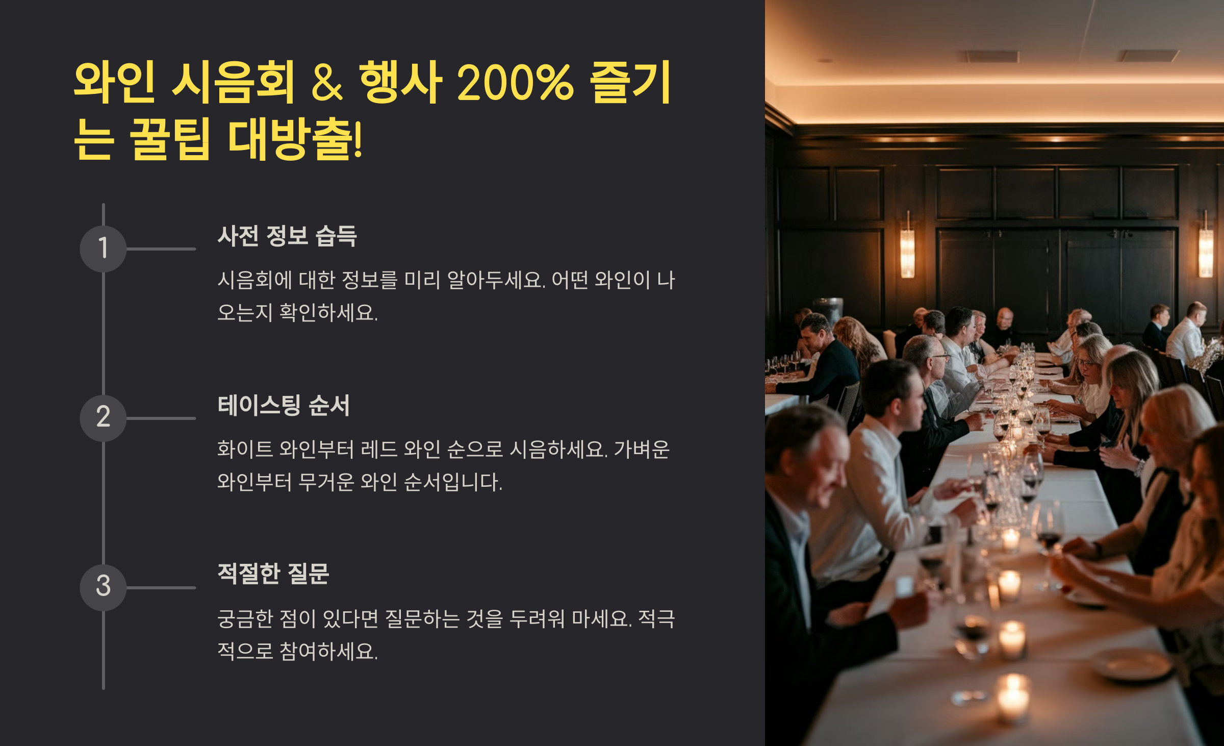 와인 시음회는 다양한 와인을 비교하고, 전문가들과 교류할 수 있는 최고의 기회예요. 참여할 때 몇 가지 팁을 알면 더 유익한 경험을 할 수 있답니다. 🍷