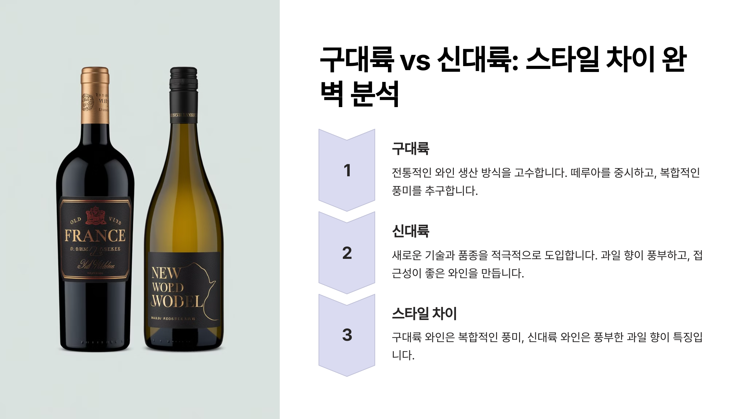 구대륙 와인은 테루아(Terroir)의 영향을 강하게 받아 지역 특성이 뚜렷하고, 전통적인 와인 제조 방식을 따르는 경우가 많아요. 반면 신대륙 와인은 현대적인 양조 기술을 적극적으로 활용해 더 과일향이 강하고 풍미가 즉각적으로 느껴지는 경우가 많답니다.