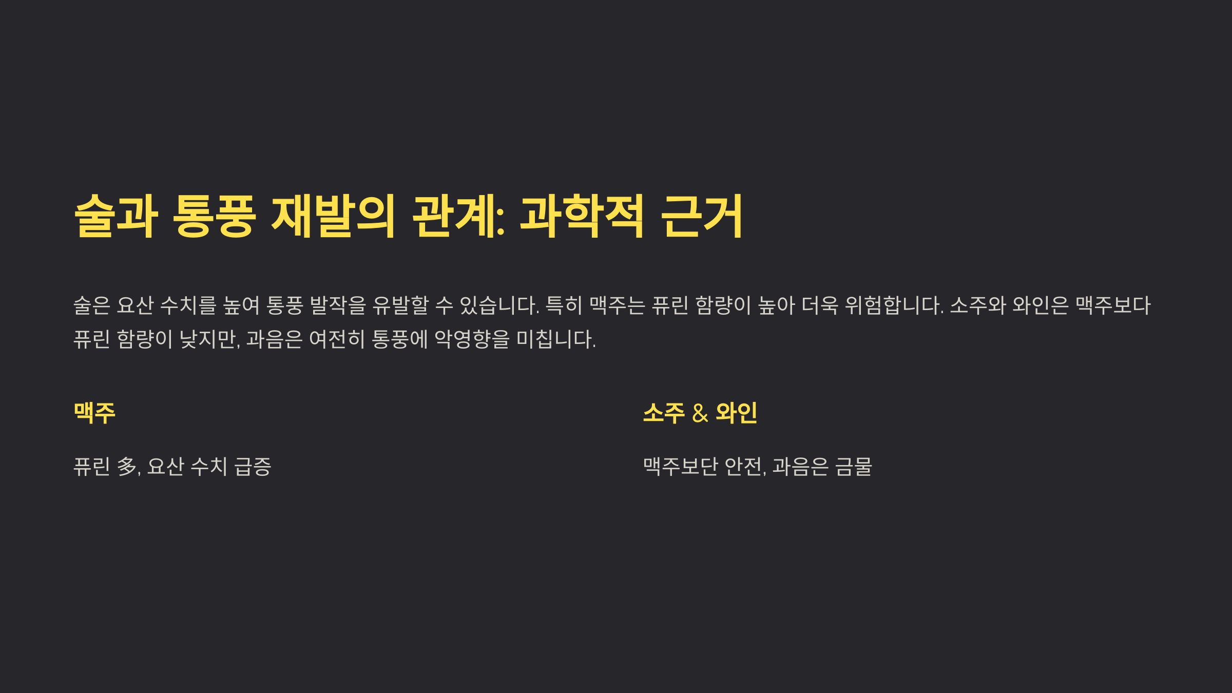 이 표를 보면, 통풍 환자에게 가장 위험한 술은 맥주라는 것을 다시 확인할 수 있어요. 반면, 와인과 증류주는 소량 섭취할 경우 상대적으로 덜 위험할 수 있지만, 어디까지나 ‘소량’이 기준이에요. 🍷