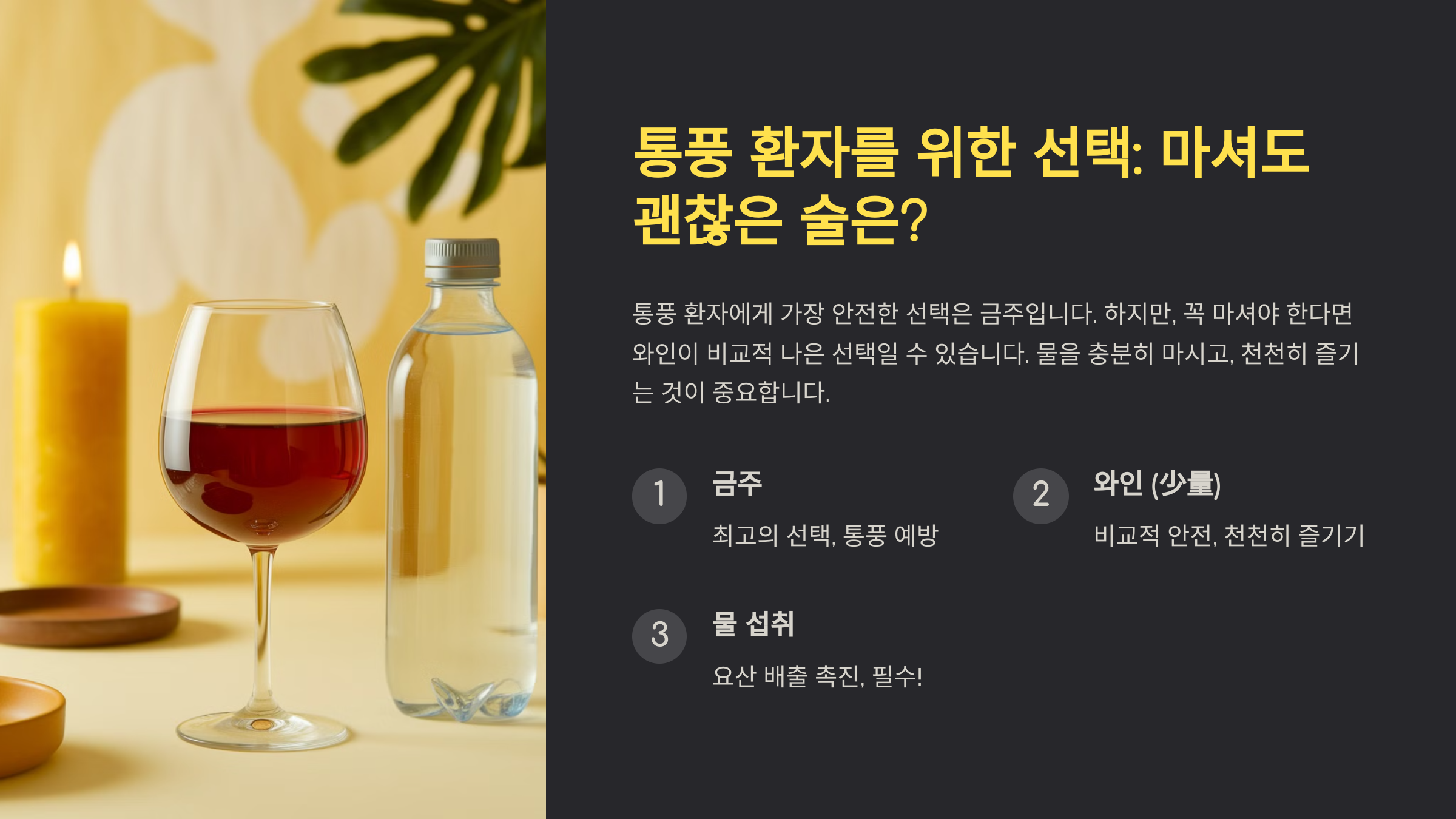 일반적으로 퓨린 함량이 높은 맥주는 절대 피해야 해요. 하지만 퓨린이 거의 없는 와인이나 증류주(소주, 위스키, 보드카 등)는 소량 섭취할 경우 상대적으로 덜 위험할 수 있어요. 다만, 알코올 자체가 요산 배출을 방해하므로 과음은 절대 금물이에요.
