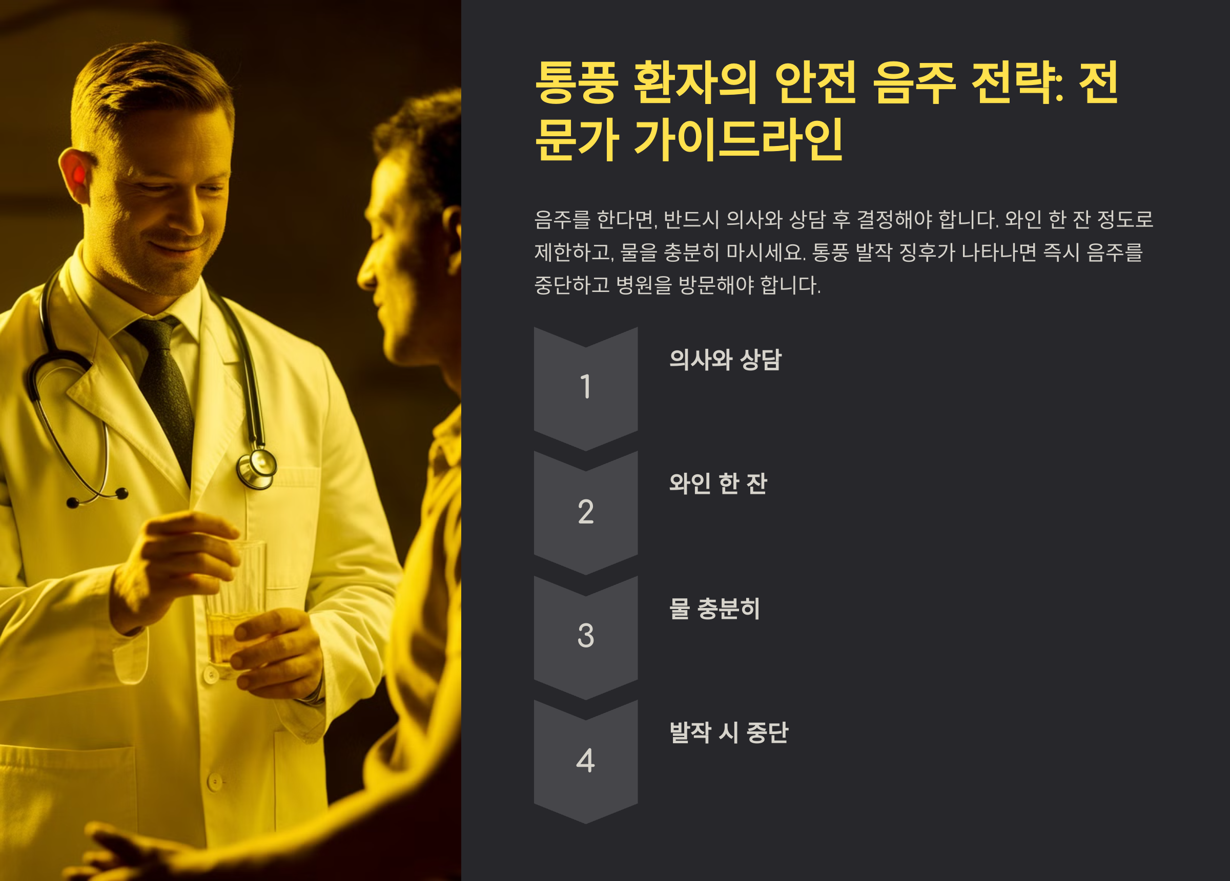완벽한 방법은 없지만, 몇 가지 주의사항을 지키면 통풍 발작 위험을 줄일 수 있어요. 먼저, 절대 과음하지 않는 것이 중요해요. 소량의 와인이나 순수한 증류주(소주, 위스키)를 마시는 것이 상대적으로 덜 위험할 수 있지만, 한두 잔을 넘기지 않는 것이 원칙이에요.