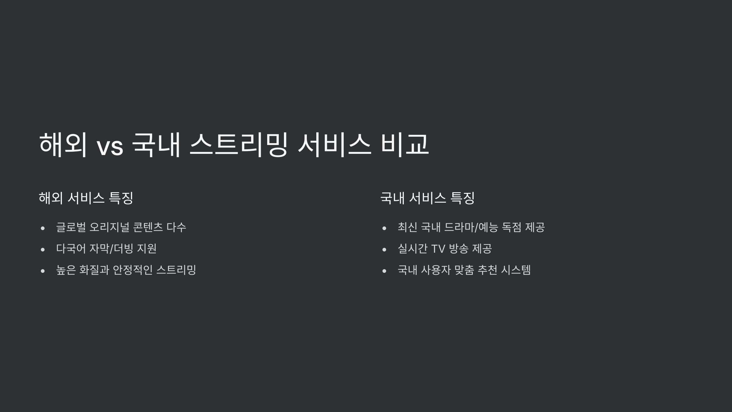 | 구분 | 해외 스트리밍 | 국내 스트리밍 |