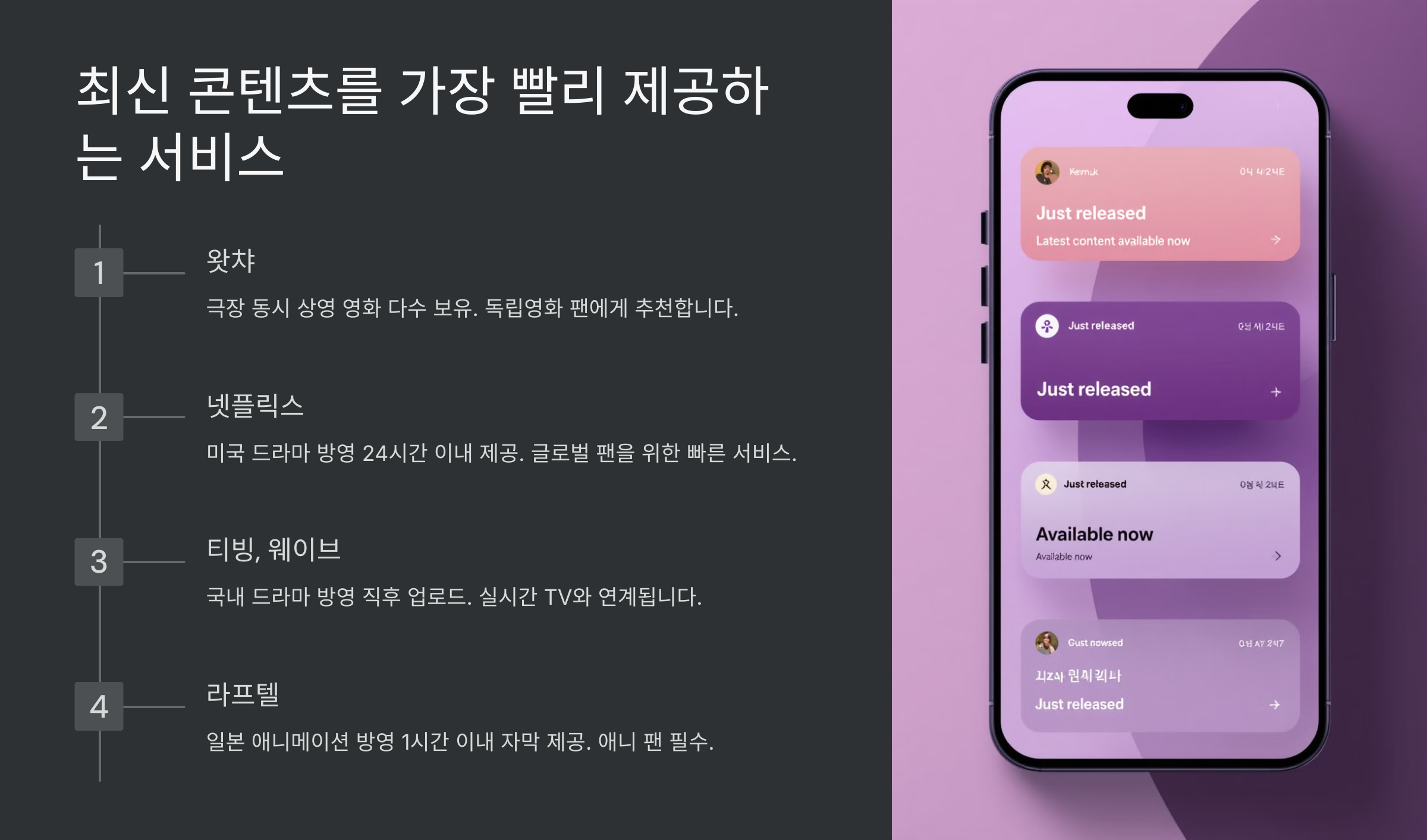다음으로, 최신 영화와 드라마를 가장 빨리 볼 수 있는 서비스는 어디인지 알아볼까요? 🎞️
