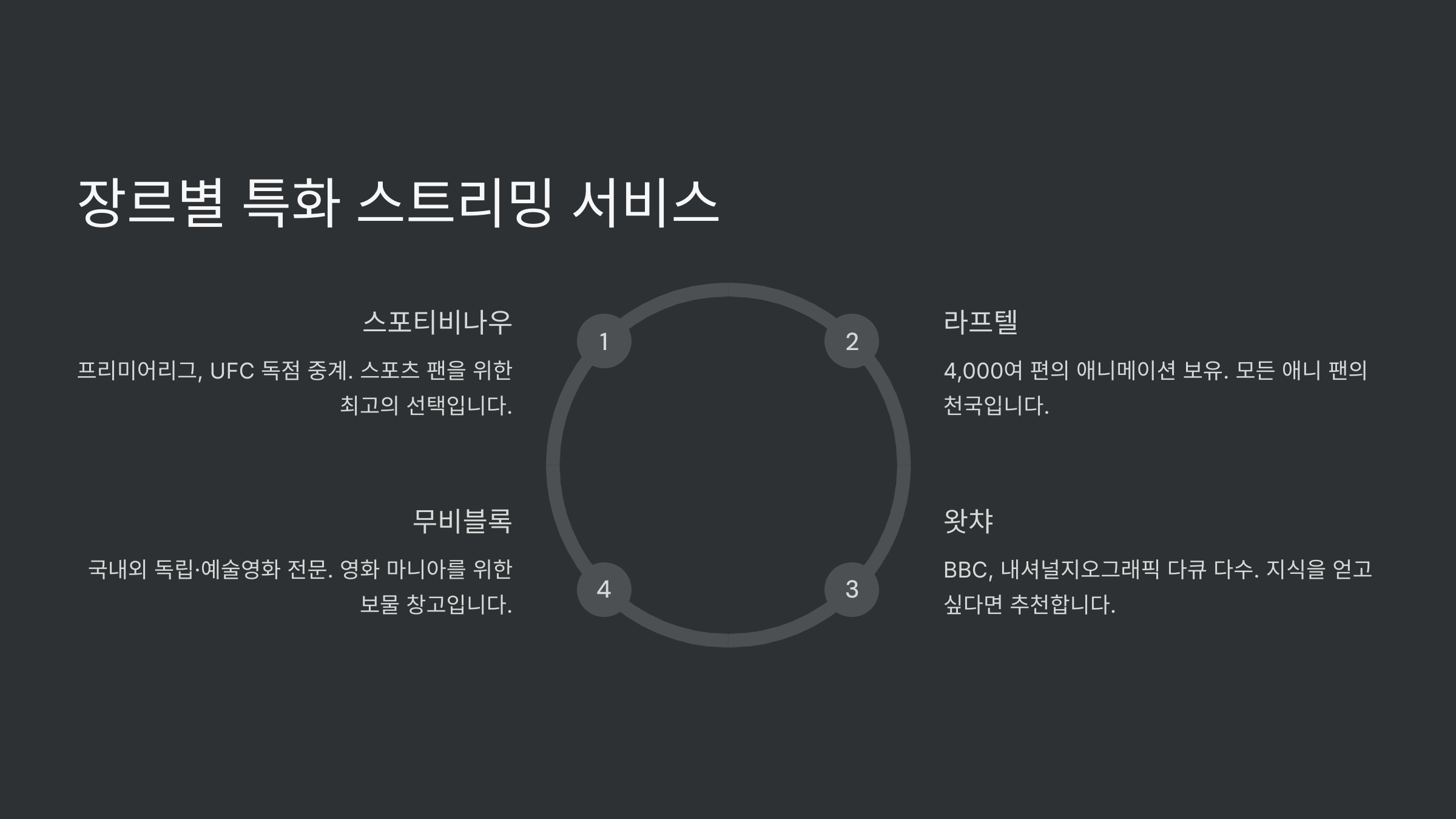 스포츠 팬이라면 SPOTV NOW나 쿠팡플레이를, 애니메이션을 좋아한다면 크런치롤과 라프텔을 추천해요. 다큐멘터리를 좋아하는 분들은 넷플릭스나 디즈니+를 이용하면 만족도가 높을 거예요! 📺