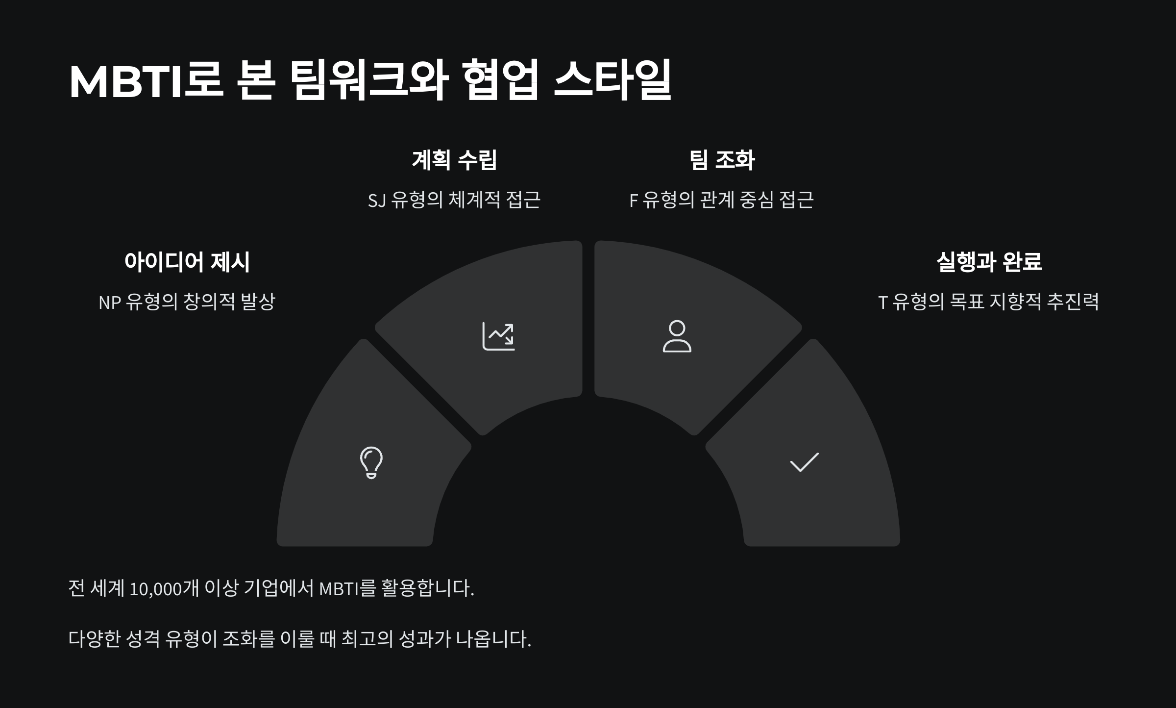 실제 팀 프로젝트에서는 MBTI를 기반으로 역할을 나누면 효율성이 올라가요. 예를 들어, ENTP는 아이디어 브레인스토밍에 적합하고, ISFJ는 꼼꼼하게 실무를 챙기는 역할에 잘 맞아요. 성향에 따라 일의 종류를 맞추면 시너지가 발생하죠. 🚀