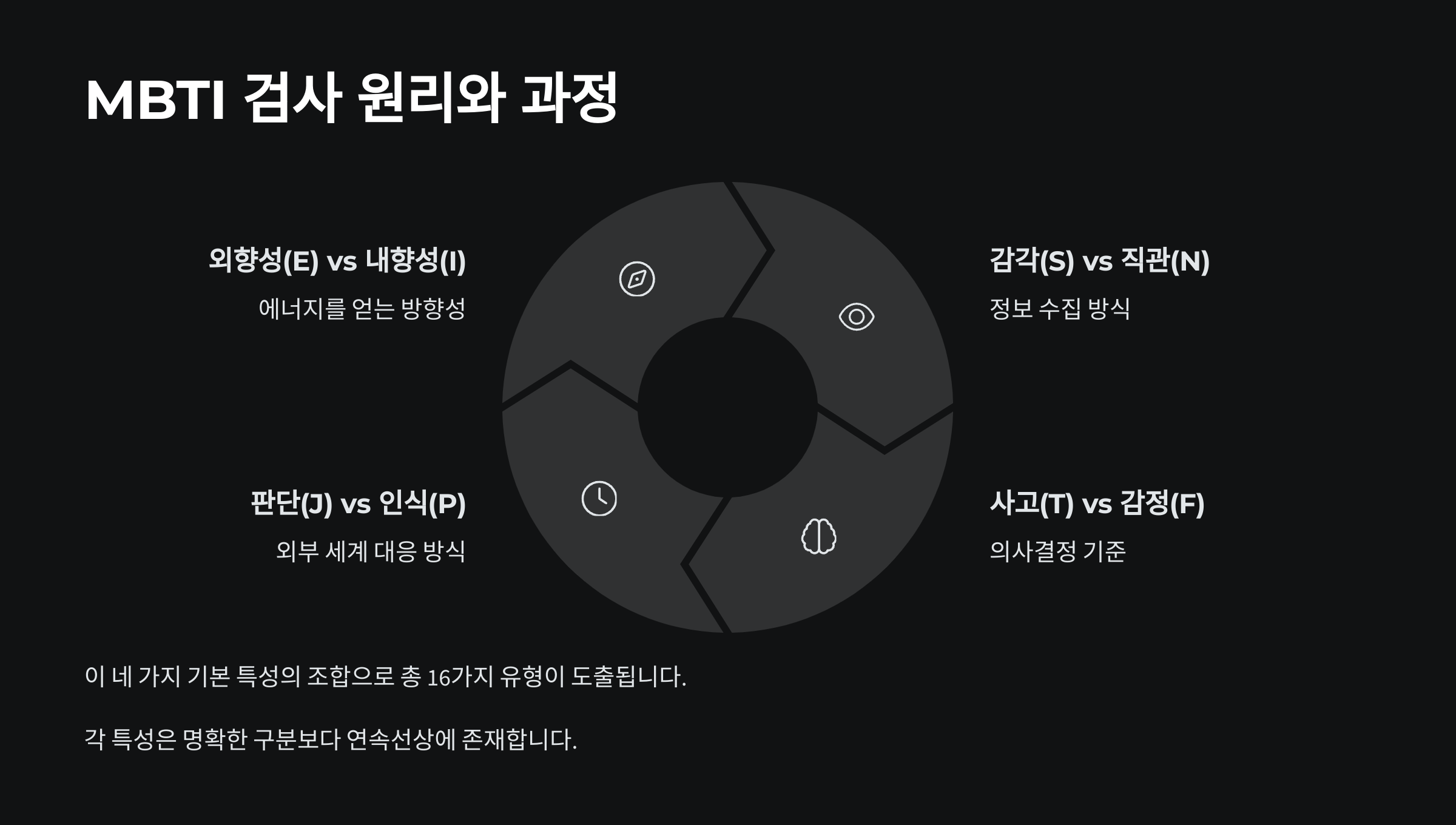 | 측정 방식 | 이분법 (E/I, S/N 등) | 연속 스펙트럼 (0~100점) |