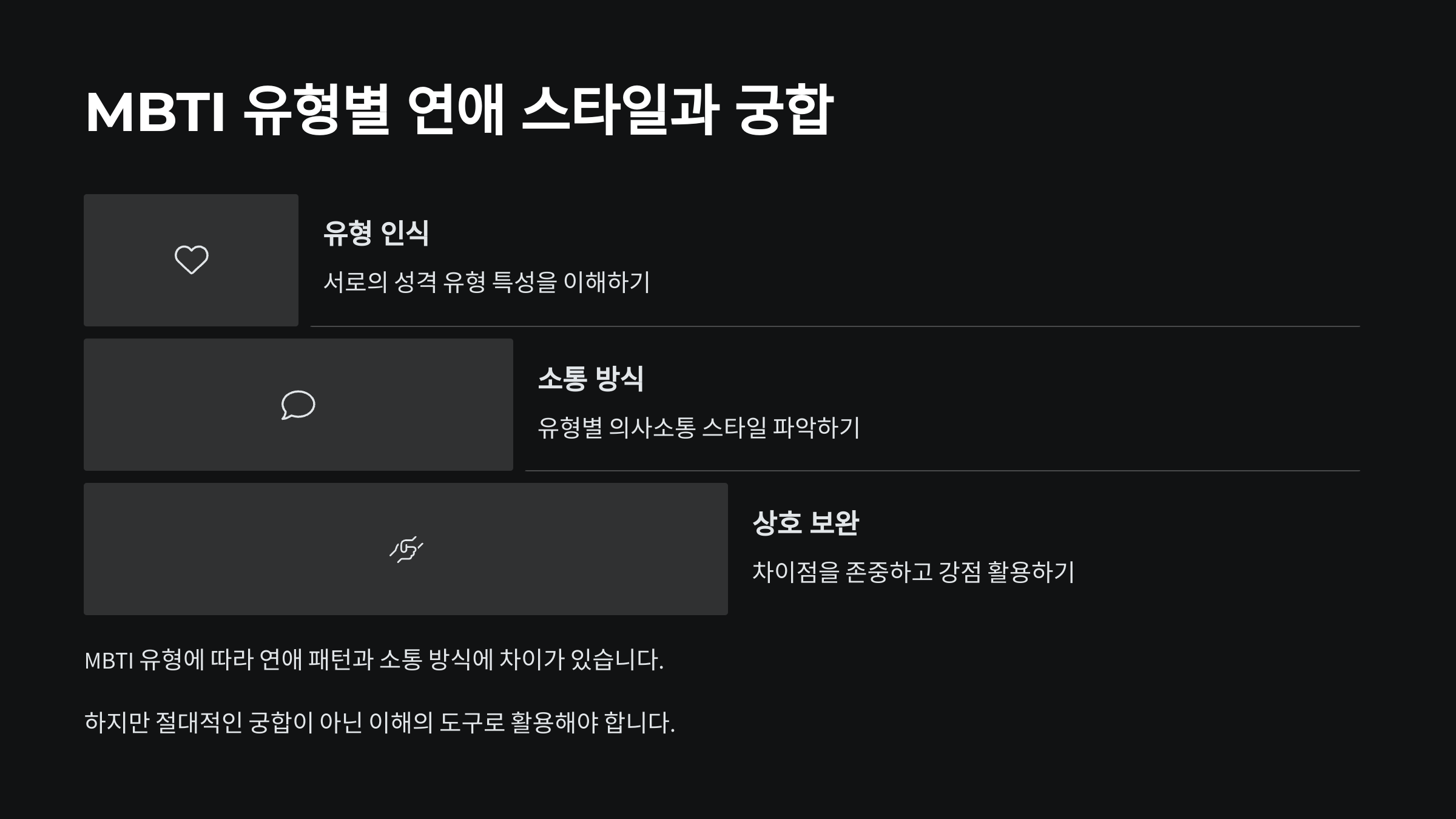 결국 중요한 건 상대방에 대한 이해와 배려, 그리고 진정성 있는 소통이에요. MBTI는 그 과정을 도와주는 힌트일 뿐, 궁합의 절대 기준은 아니에요. 사람의 마음은 MBTI보다 훨씬 더 복잡하고 아름다우니까요. 💗