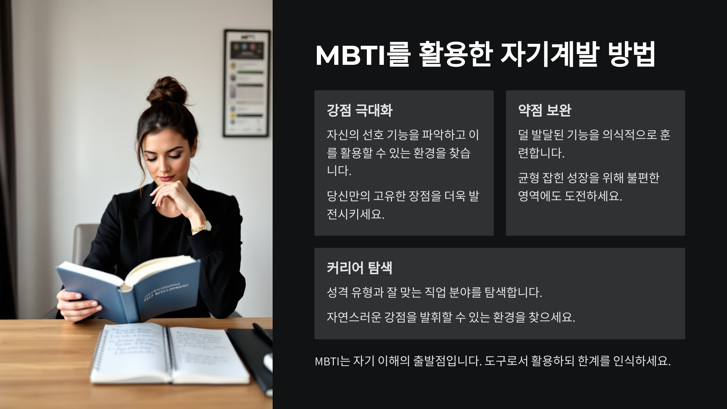 자기계발에서 중요한 포인트는, 약점을 무리하게 고치려 하기보다 강점을 어떻게 극대화하느냐예요. 예를 들어 INTP는 외향적인 환경보다는 조용한 공간에서 깊이 있는 사고를 할 때 능력을 발휘하니까, 이 점을 살려 연구나 기획 쪽으로 커리어를 확장할 수 있어요. 🔍