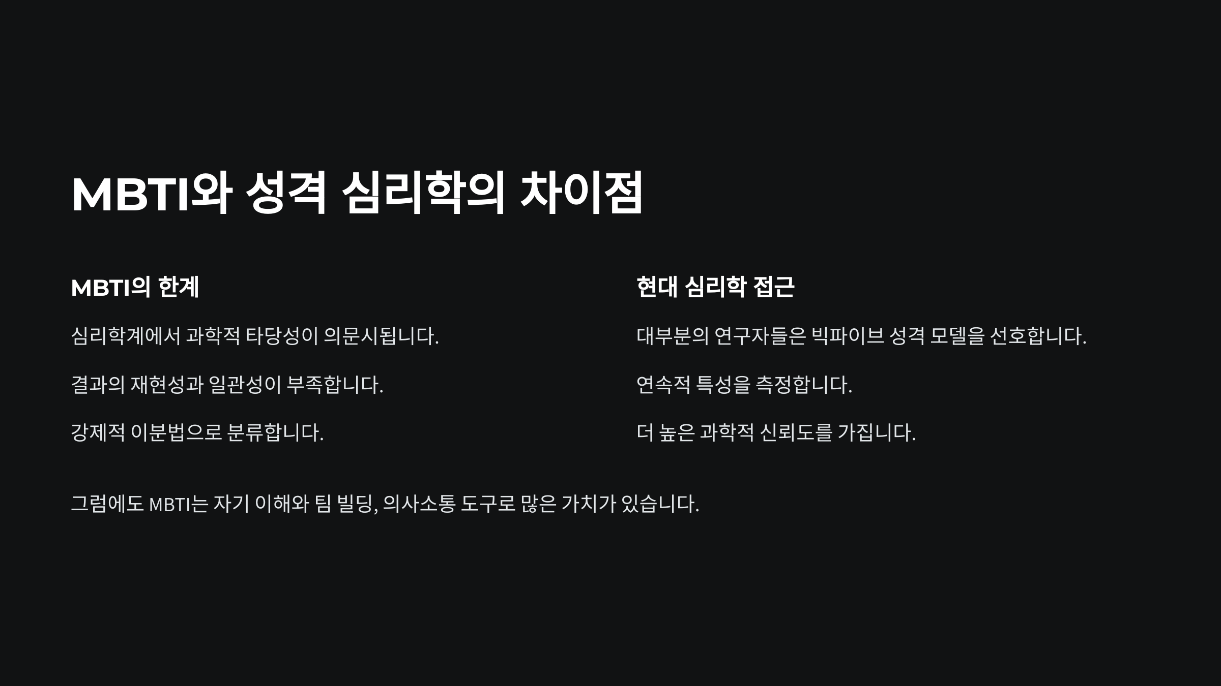 성격 심리학에서는 개인 차이를 다양하게 측정하고, 이를 통해 행동 예측이나 정서적 안정에 도움을 줄 수 있는 체계적인 접근을 중시해요. MBTI는 이와 달리 사람들이 서로 다르다는 사실을 인정하고, 그 다름을 이해하는 데 초점을 맞추죠. 🙌