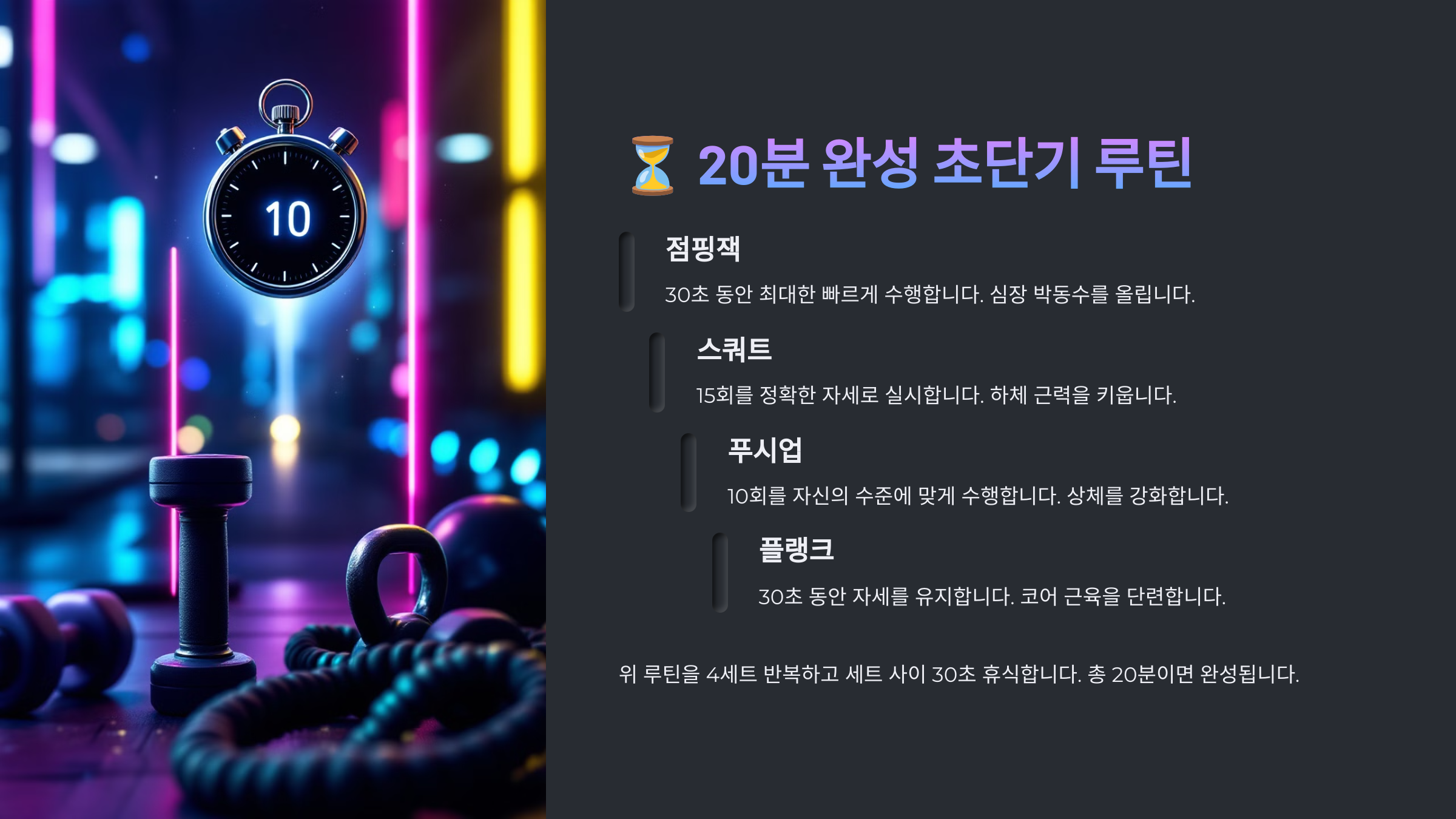 이제 빠르게 끝낼 수 있는 20분 초단기 루틴을 살펴볼까요? ⏳