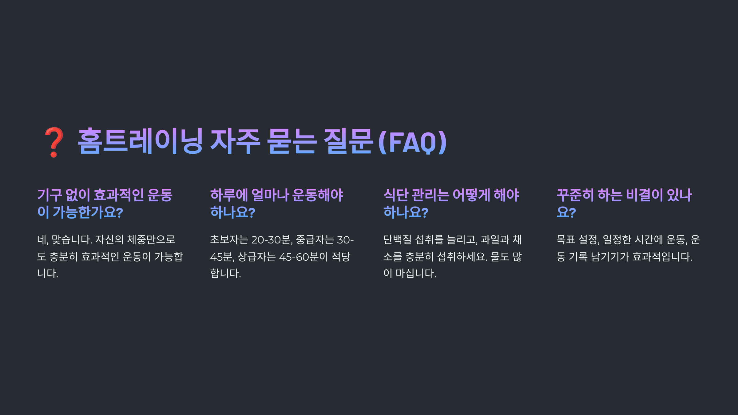 이제 홈트레이닝과 관련된 자주 묻는 질문(FAQ)을 살펴볼까요? ❓