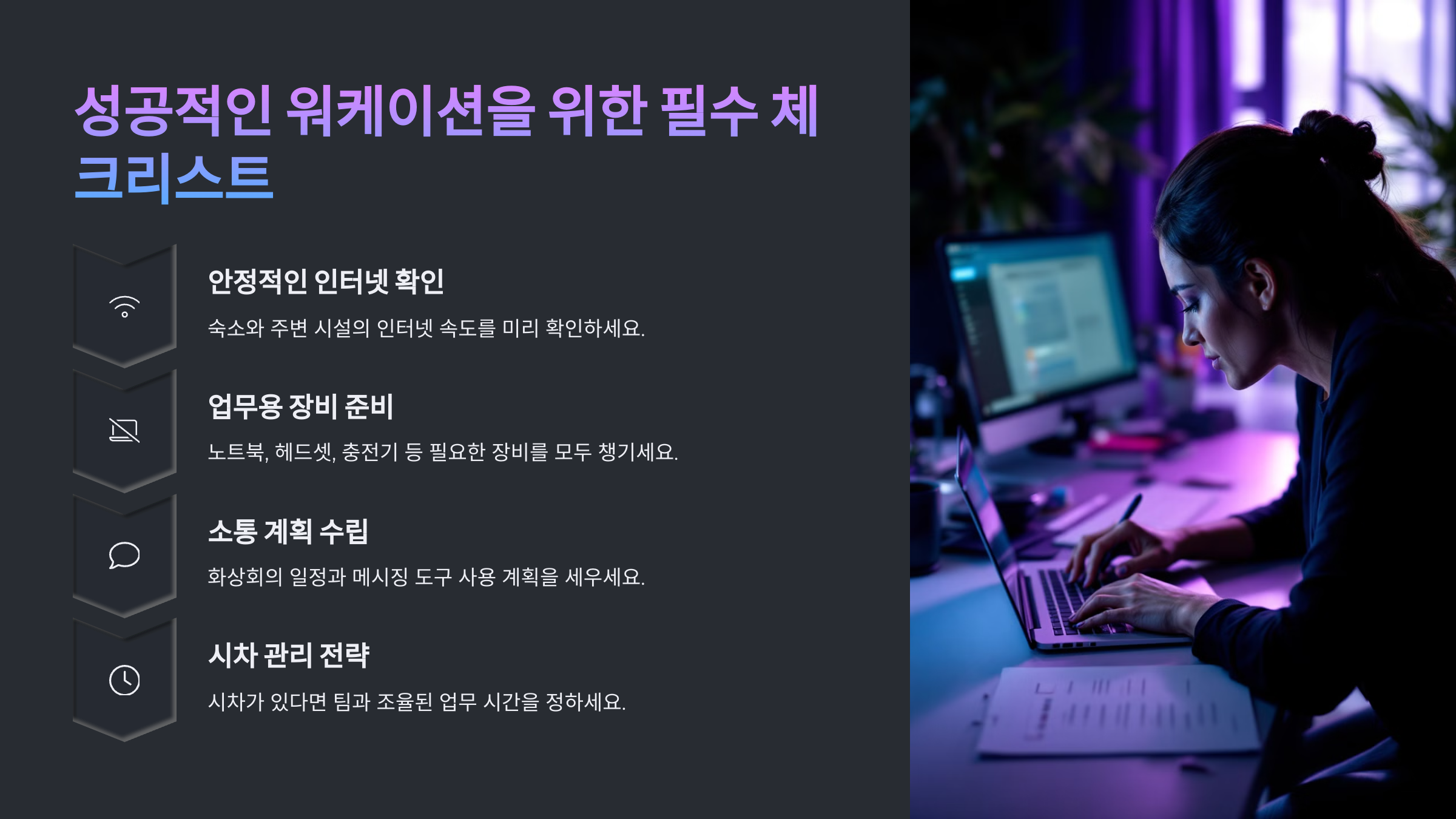 워케이션을 성공적으로 수행하려면 ‘업무 환경’, ‘인터넷 환경’, ‘숙소’, ‘시간 관리’ 등 필수 요소를 미리 점검해야 해요. 🏝️