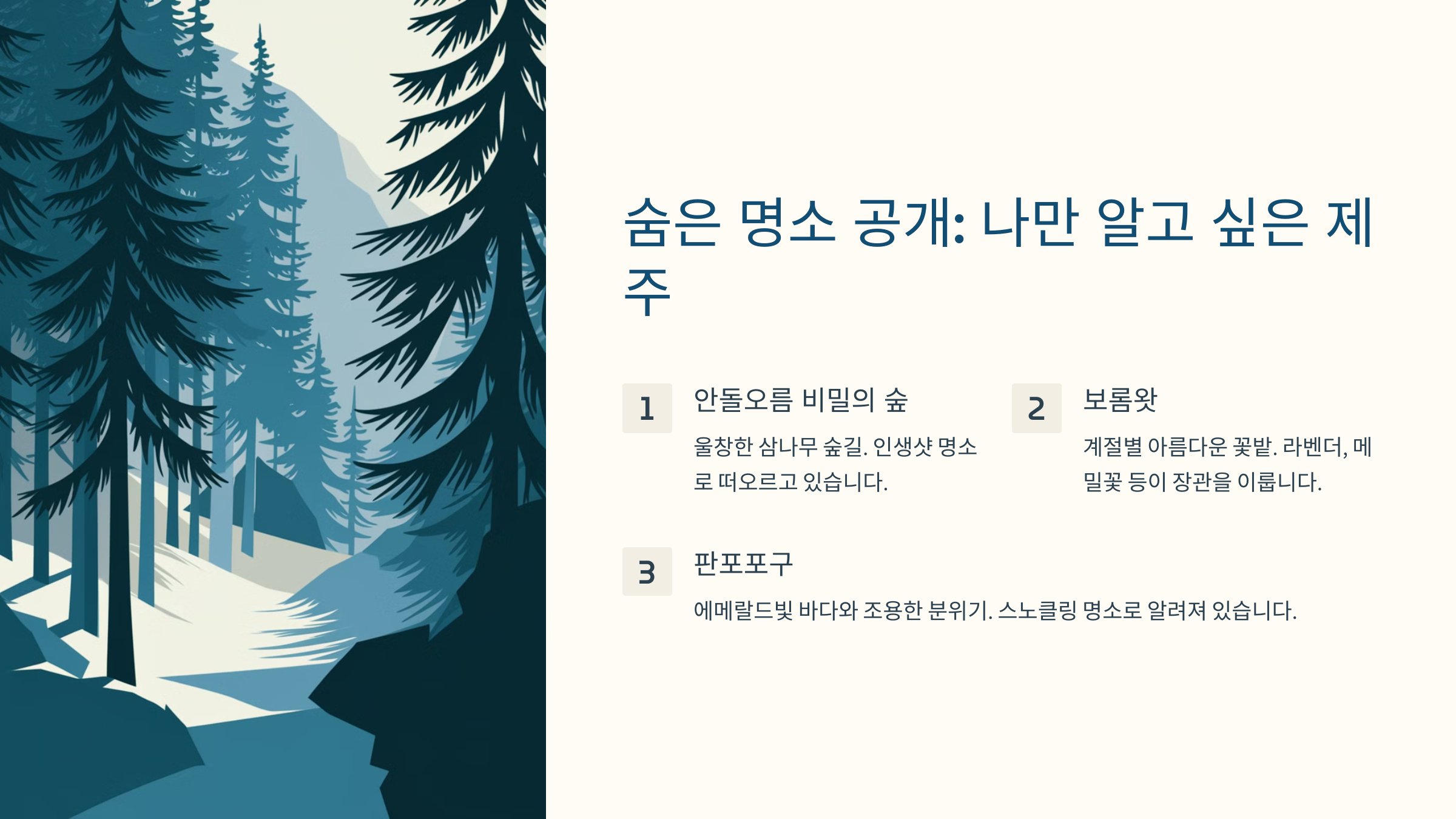 제주도에는 유명한 관광지뿐만 아니라 아는 사람만 아는 숨은 명소들도 많아요! SNS에서 뜨고 있는 핫플과 조용히 힐링할 수 있는 비밀스러운 장소들을 소개할게요. 📸✨