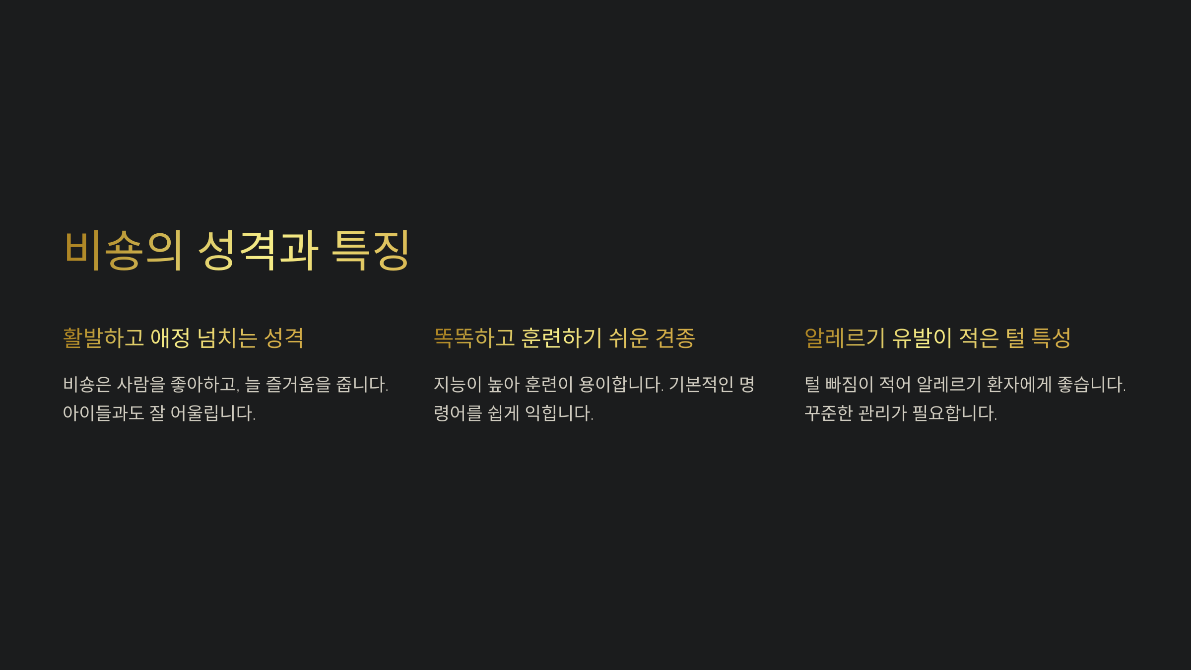 비숑은 원래 프랑스에서 귀족들이 키우던 반려견이었어요. 그래서인지 우아한 모습과 함께 애교가 넘치는 성격을 가지고 있어요. 보호자와의 교감을 중요하게 생각하며, 외로움을 잘 타는 편이기도 해요. 💕