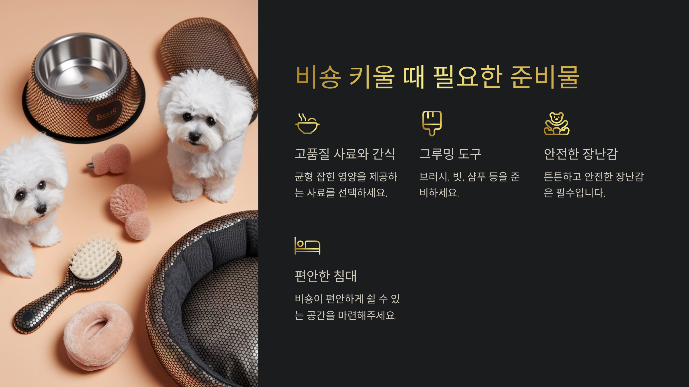 비숑은 활발하고 털 관리가 중요한 견종이라, 일반 강아지보다 더 세심한 준비가 필요해요. 기본적인 용품뿐만 아니라 털 관리 도구, 장난감, 건강을 위한 용품까지 꼼꼼히 준비해야 해요! ✨