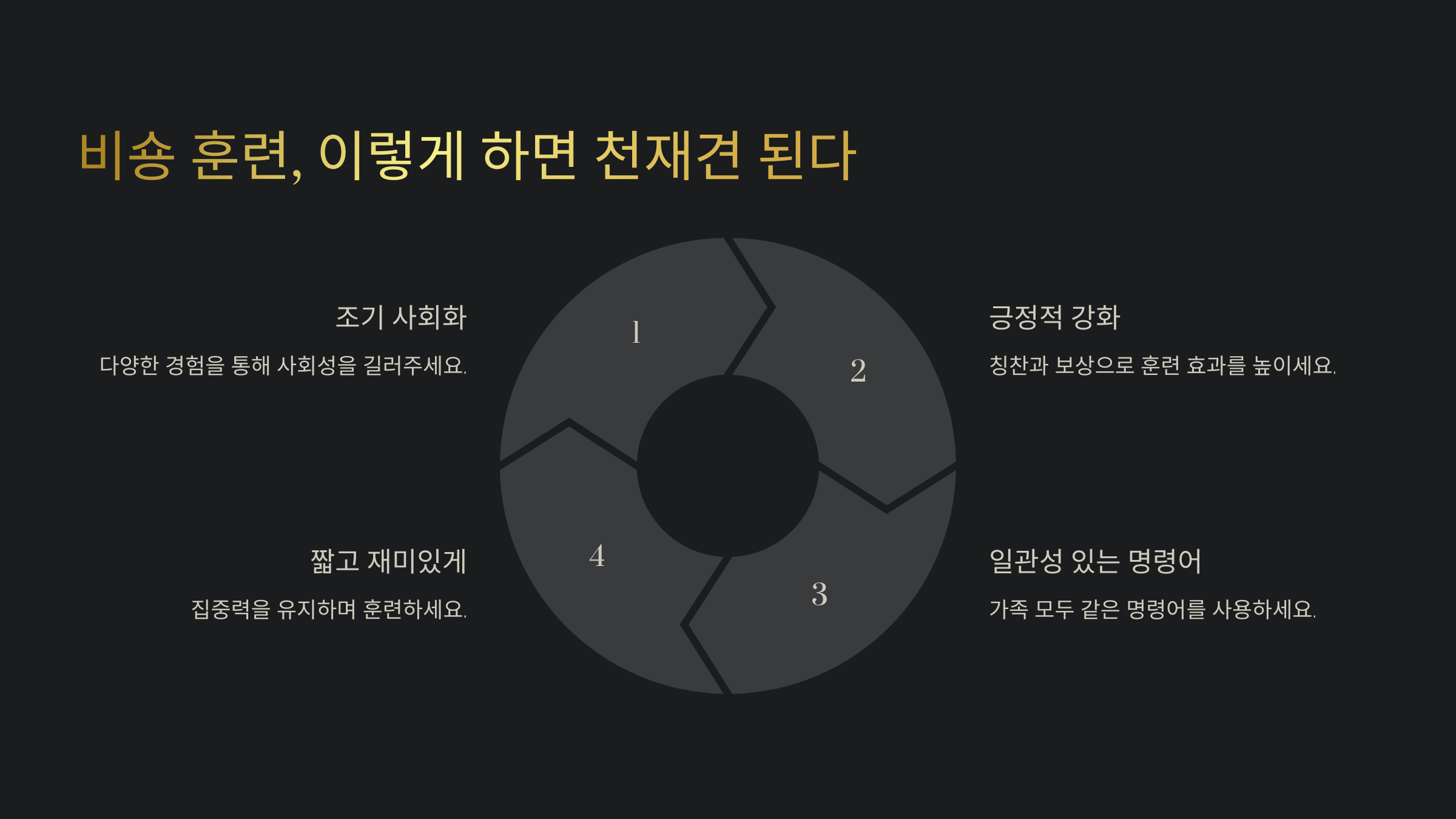 | 배변 훈련 | 정해진 장소에서 배변할 수 있도록 유도 | 일관되게 반복 |