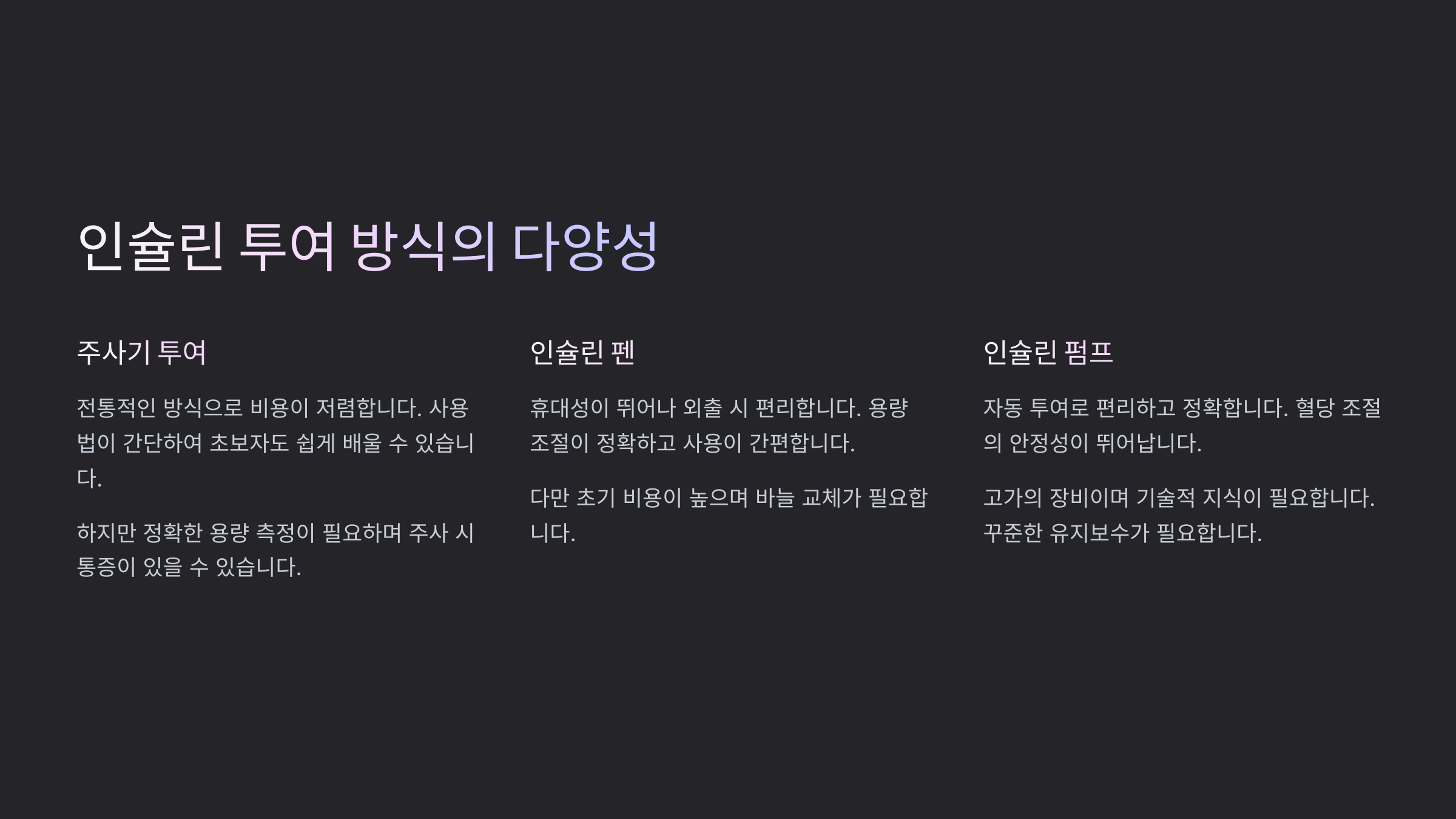 | 주사기 | 저렴하고 다양한 인슐린 사용 가능 | 정확한 용량 조절이 어렵고 번거로움 |