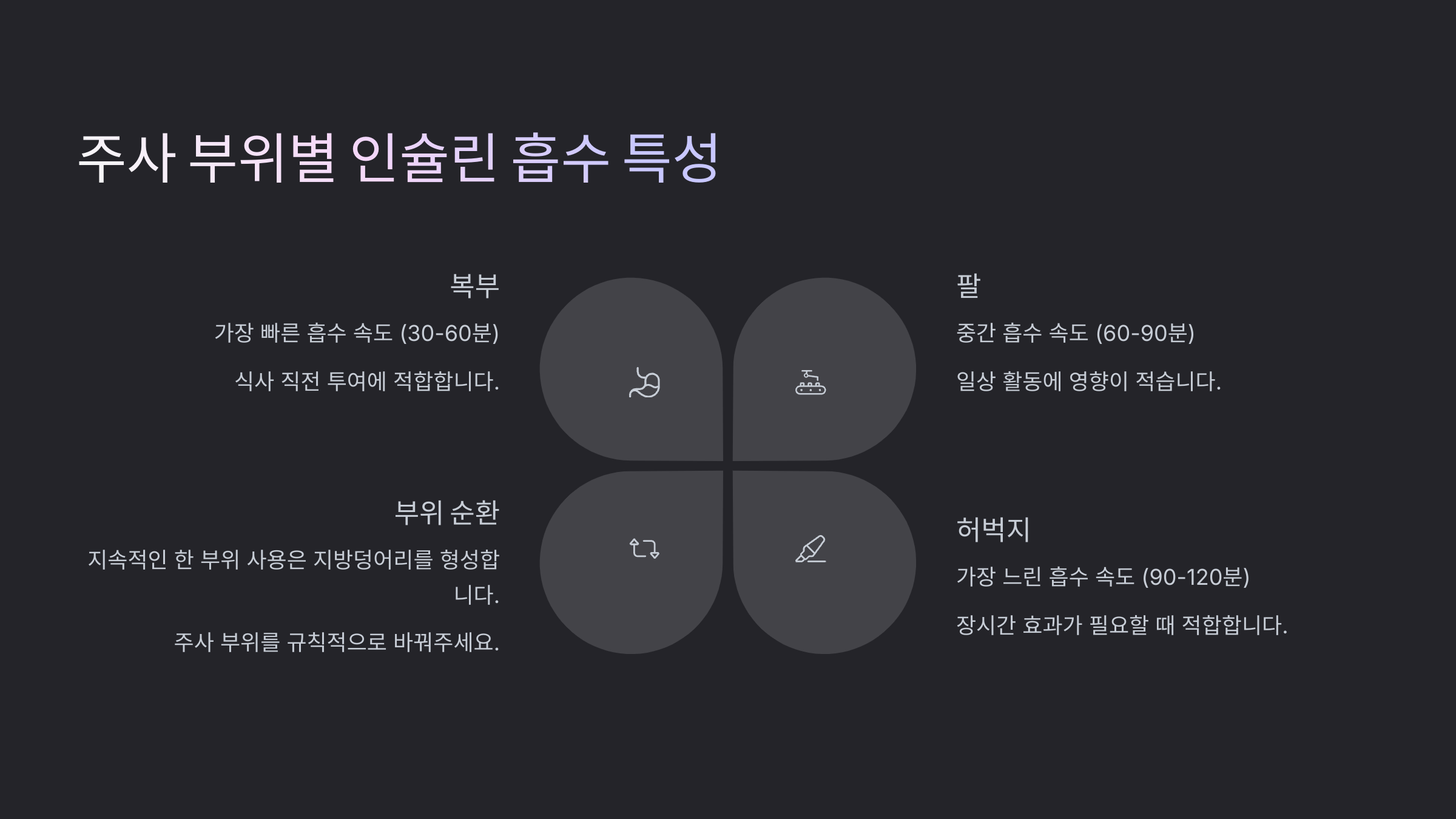 인슐린을 어디에 주사하느냐에 따라 흡수 속도와 효과가 달라질 수 있어요. 일반적으로 복부, 허벅지, 팔, 엉덩이가 가장 많이 사용되는 부위예요.