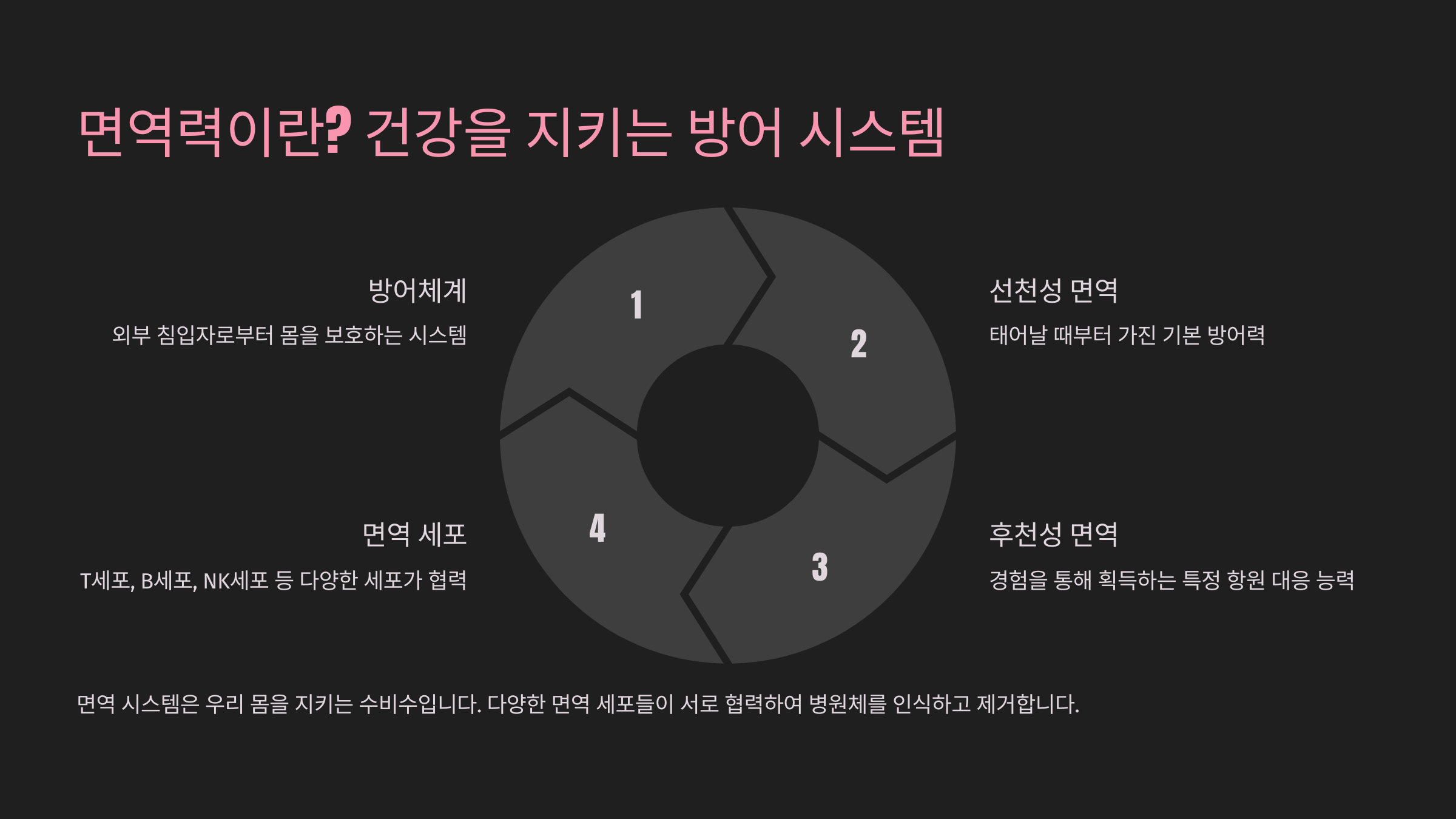 면역력은 우리 몸을 외부 병원체로부터 보호하는 자연적인 방어 시스템이에요. 면역 체계는 선천면역과 후천면역으로 나뉘며, 각각의 역할이 달라요. 선천면역은 태어날 때부터 갖고 있는 방어 기능으로, 피부, 점막, 백혈구 등이 포함돼요. 반면, 후천면역은 백신이나 감염을 통해 획득한 면역력을 의미해요.