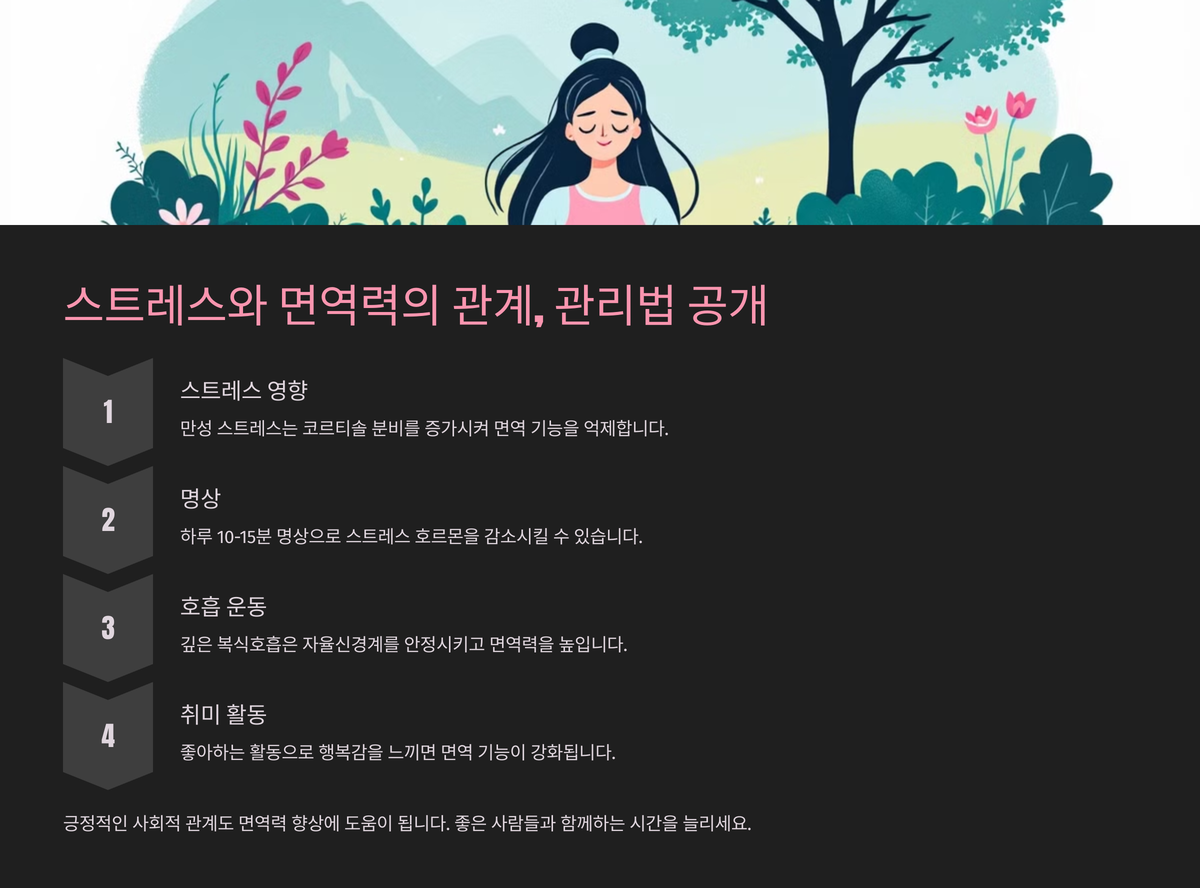 스트레스를 완벽하게 없앨 수는 없지만, 위의 방법들을 실천하면 효과적으로 관리할 수 있어요. 💆♀️ 이렇게 생활 습관을 개선하면 면역력을 유지하고 건강한 삶을 살 수 있답니다!