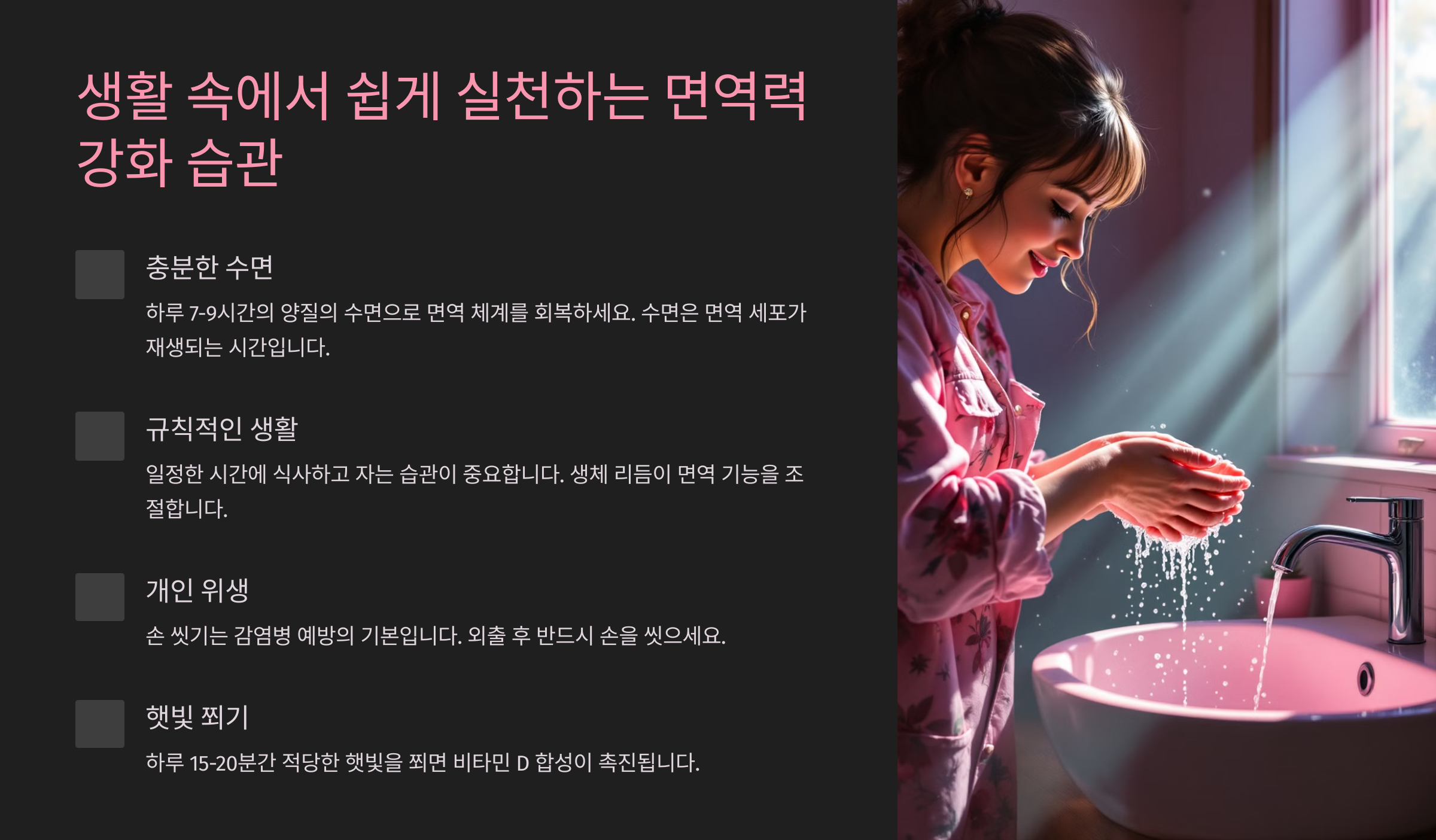 우리 몸은 규칙적인 생활 리듬을 가질 때 가장 건강한 상태를 유지할 수 있어요. 충분한 수면, 스트레스 관리, 적절한 수분 섭취, 위생 관리 등은 면역력 강화를 위한 필수 습관이에요. 작은 변화만으로도 면역력을 크게 향상시킬 수 있답니다!