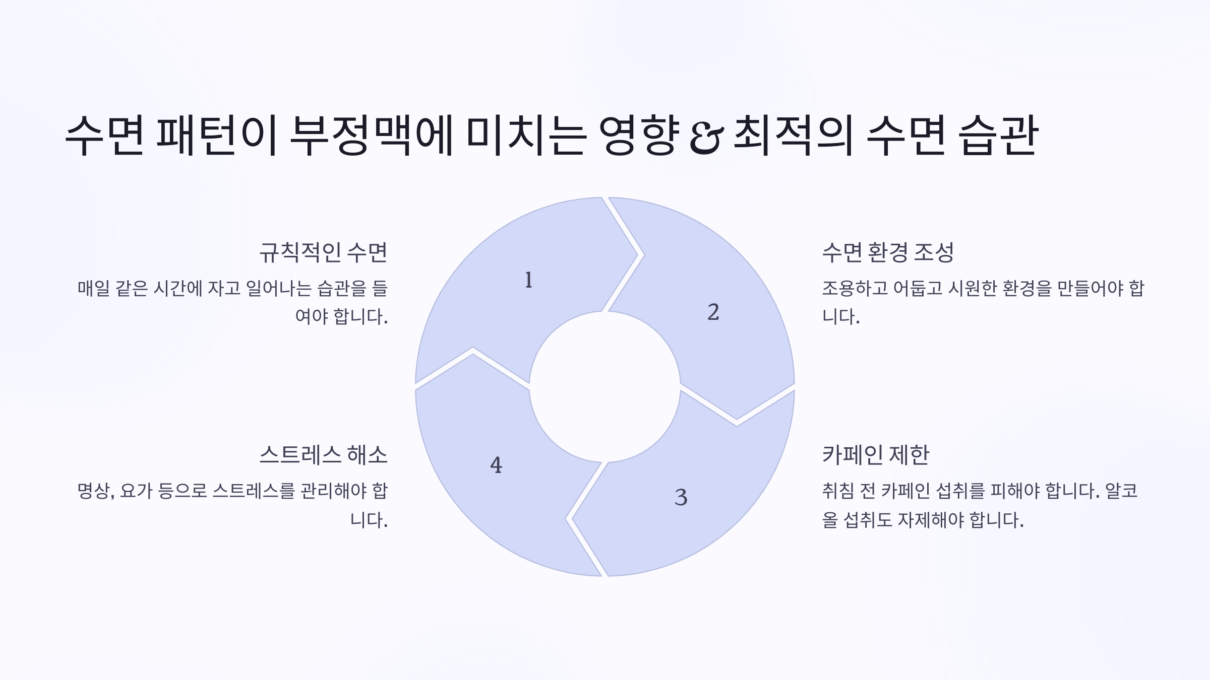 | 저녁~취침 전 | 스트레스, 카페인 섭취 | 카페인 제한, 편안한 환경 조성 |