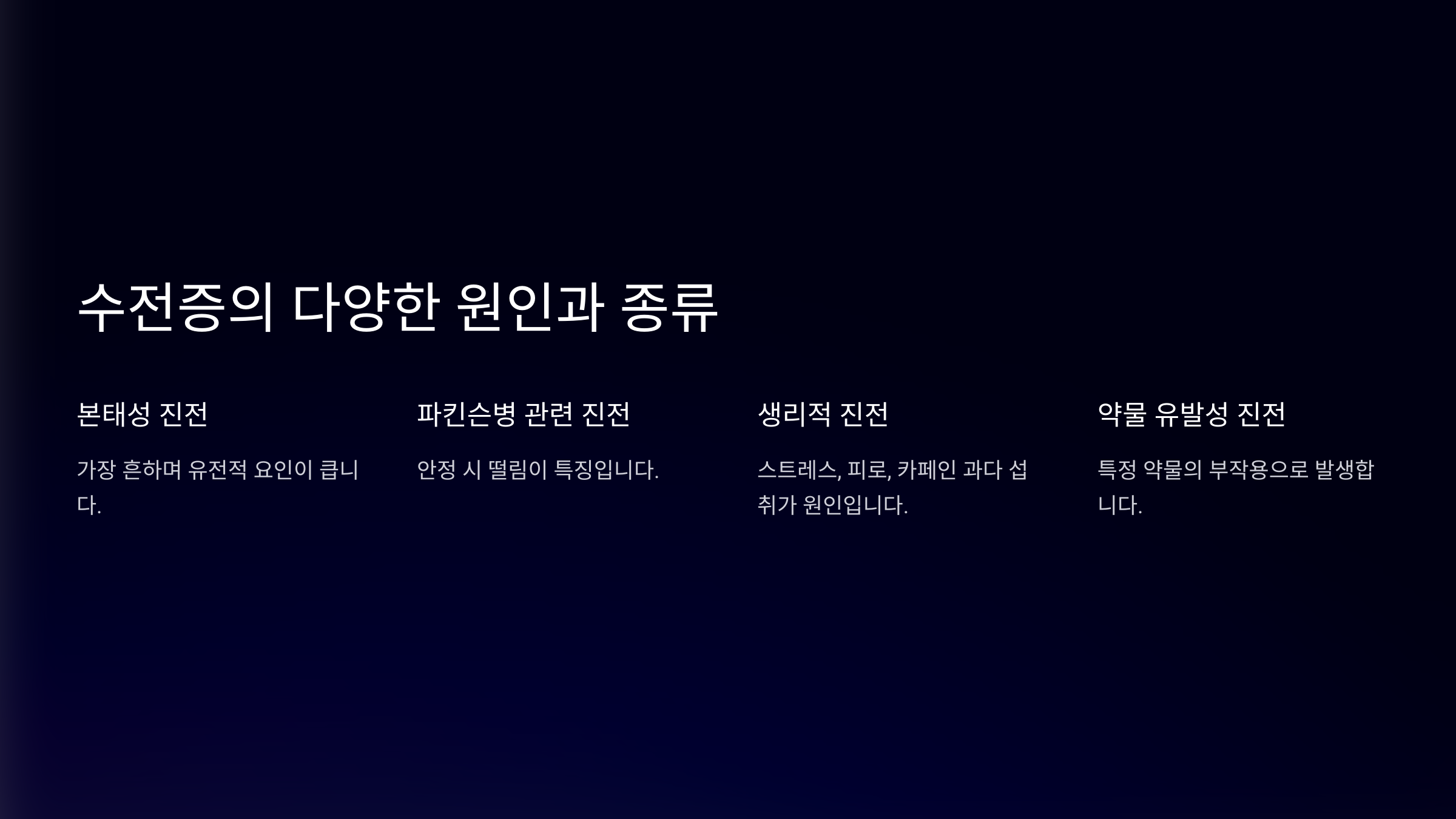 | 본태성 진전 | 유전적 영향이 크고, 움직일 때 심해짐 | 유전적 요인 |
