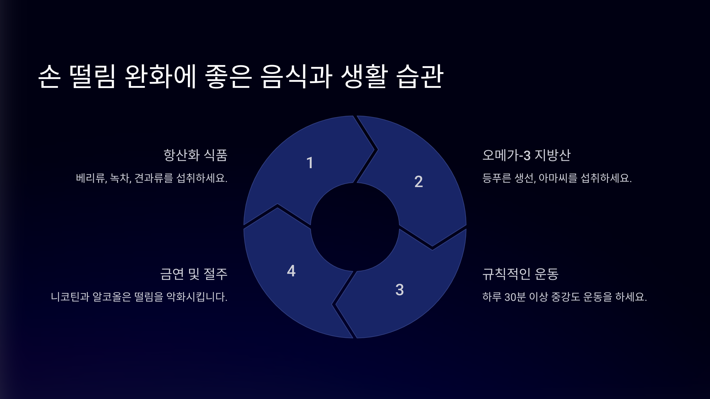 음식뿐만 아니라 생활 습관도 중요해요! 규칙적인 운동, 스트레스 관리, 충분한 수면을 통해 신경계를 안정시키면 손 떨림을 예방할 수 있어요. 🧘♂️