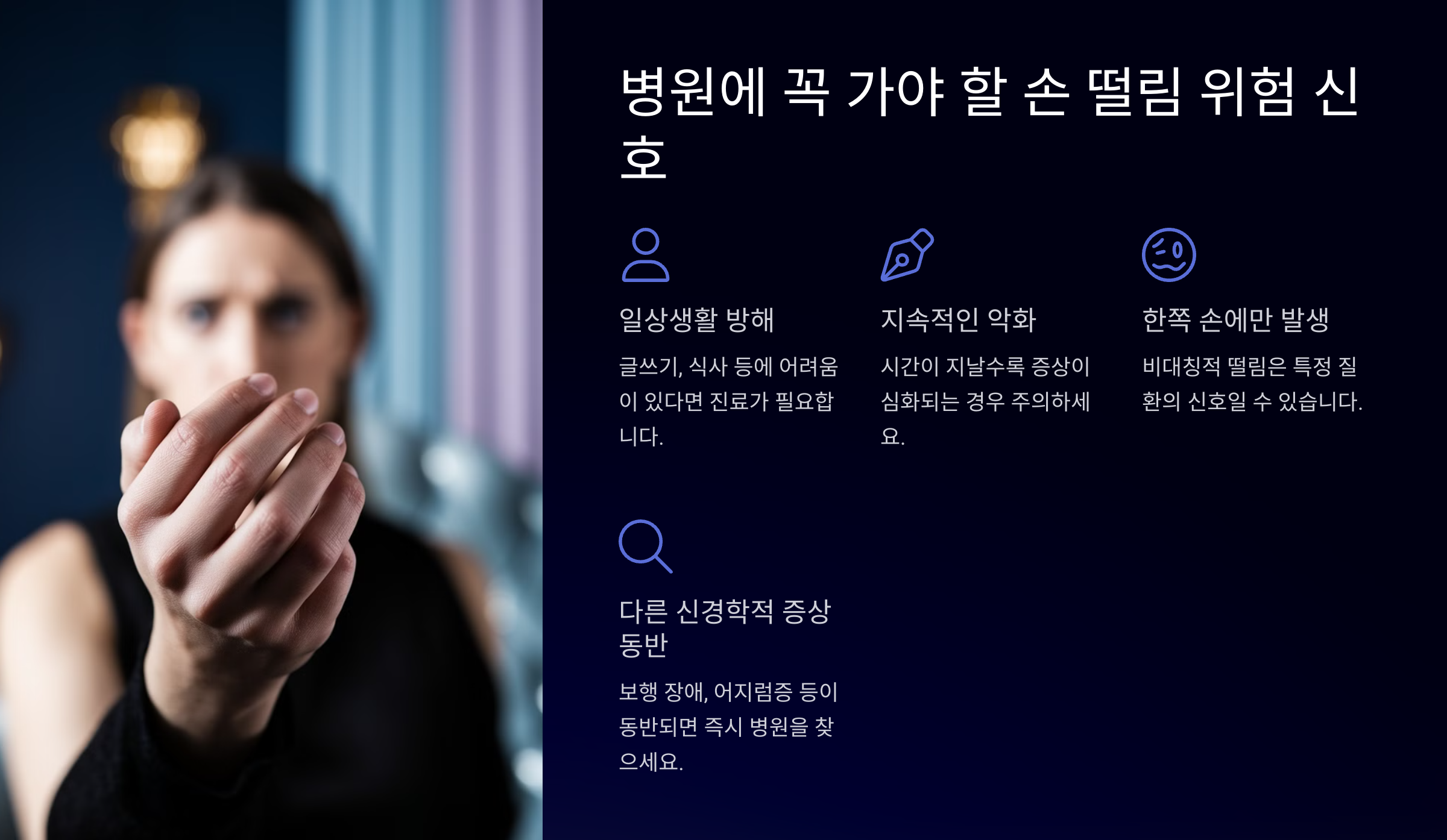 ✔ 손 떨림이 한쪽 손에서 시작되거나 말이 어눌해지고, 몸이 둔해지는 증상과 함께 나타난다면 즉시 병원에 방문해야 해요! 🚑