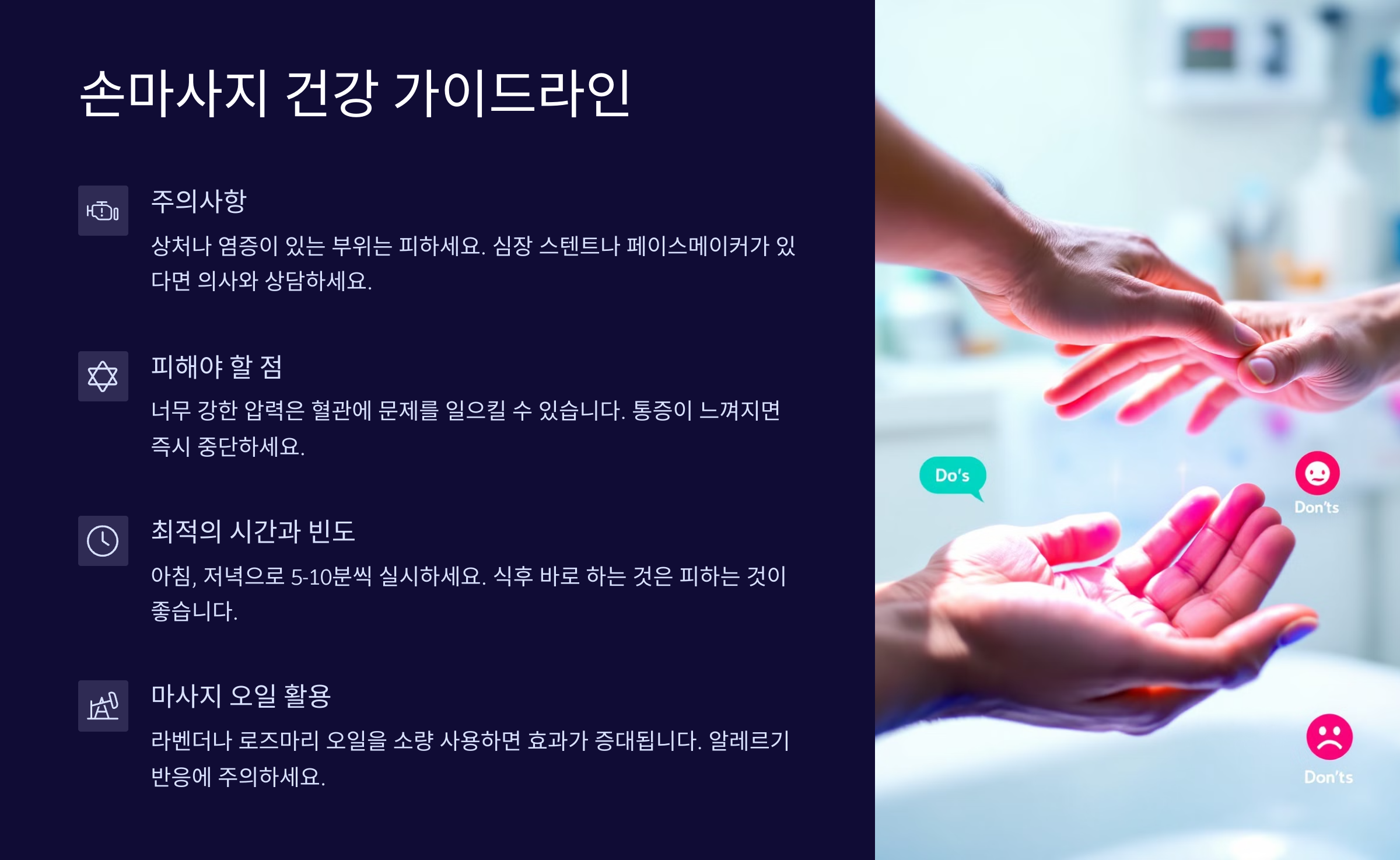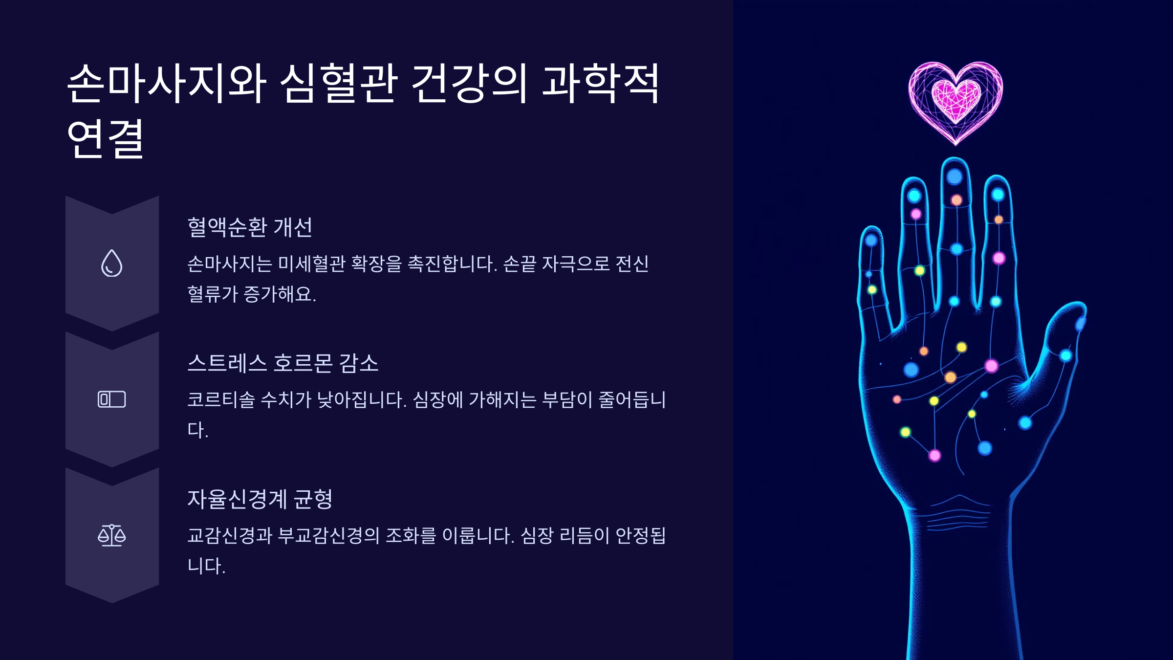 의학적으로도, 손 자극이 교감신경과 부교감신경 사이의 밸런스를 맞추는 데 도움이 된다는 연구 결과가 있어요. 특히 고혈압이 있는 사람은 스트레스를 받으면 혈관이 수축되기 쉬운데, 손마사지로 부드럽게 자극을 주면 혈관이 이완되어 혈압이 천천히 안정되는 효과가 나타날 수 있어요.
