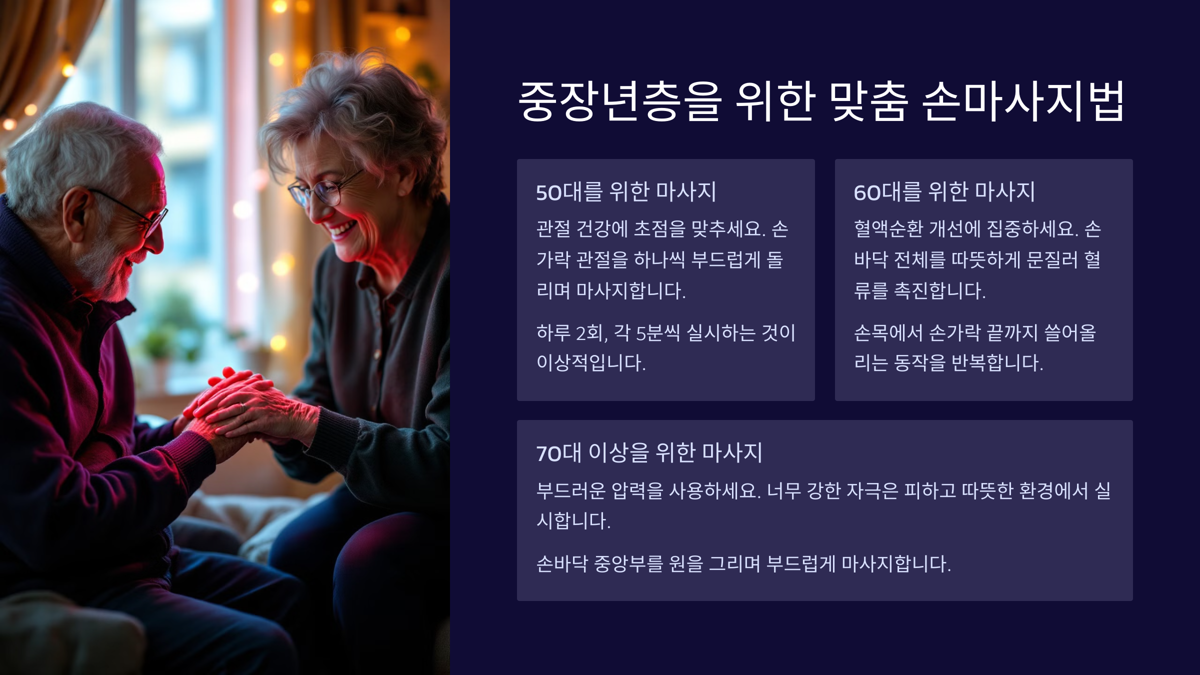 A8. 특히 40대 이상 중장년층에게 중요해요. 심혈관 질환 발생률이 높아지는 시기라 정기적인 손마사지가 큰 도움이 될 수 있어요.